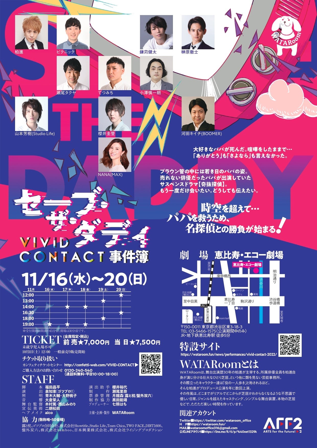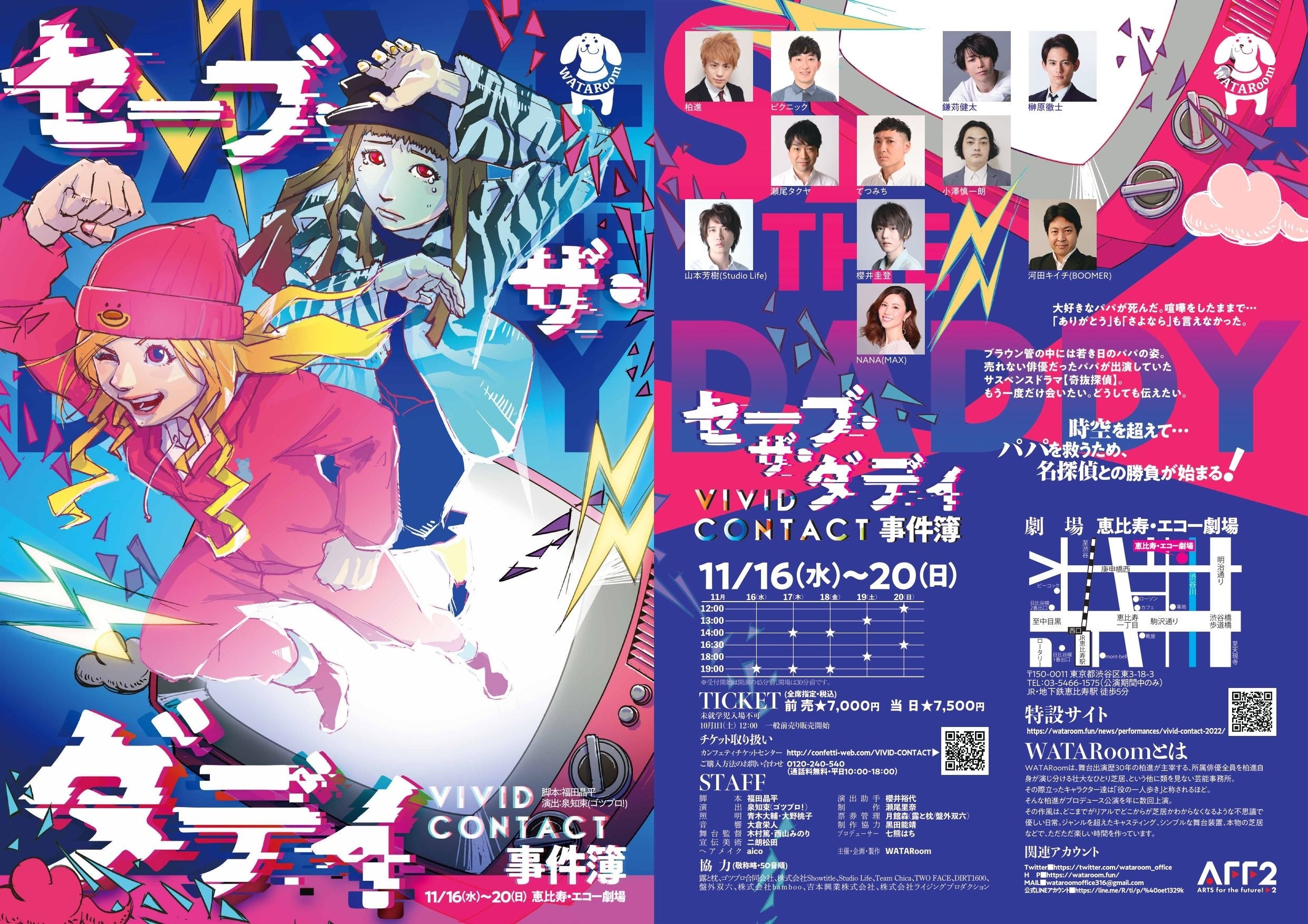 WATARoom 舞台『セーブ・ザ・ダディ』~VIVID CONTACT事件簿~ が2022年11月16日(水)~11月20日(日)に恵比寿・エコー劇場(東京都渋谷区)にて上演されます。チケットはカンフェティ(運営:ロングランプランニング株式会社、東京都新宿区、代表取締役:榑松 ⼤剛)にて10月1日(土)より発売開始です。