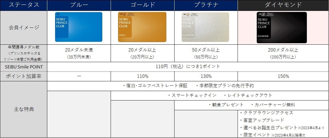 株式会社西武・プリンスホテルズワールドワイド(本社:東京都豊島区南池袋1-16-15、 代表取締役社長:小山正彦)は、2023年度「プリンスステータスサービス」に、最上位ステータスとなる「ダイヤモンド」を新設し、2022年10月10日(月・祝)より一部サービスを先行して開始いたします。