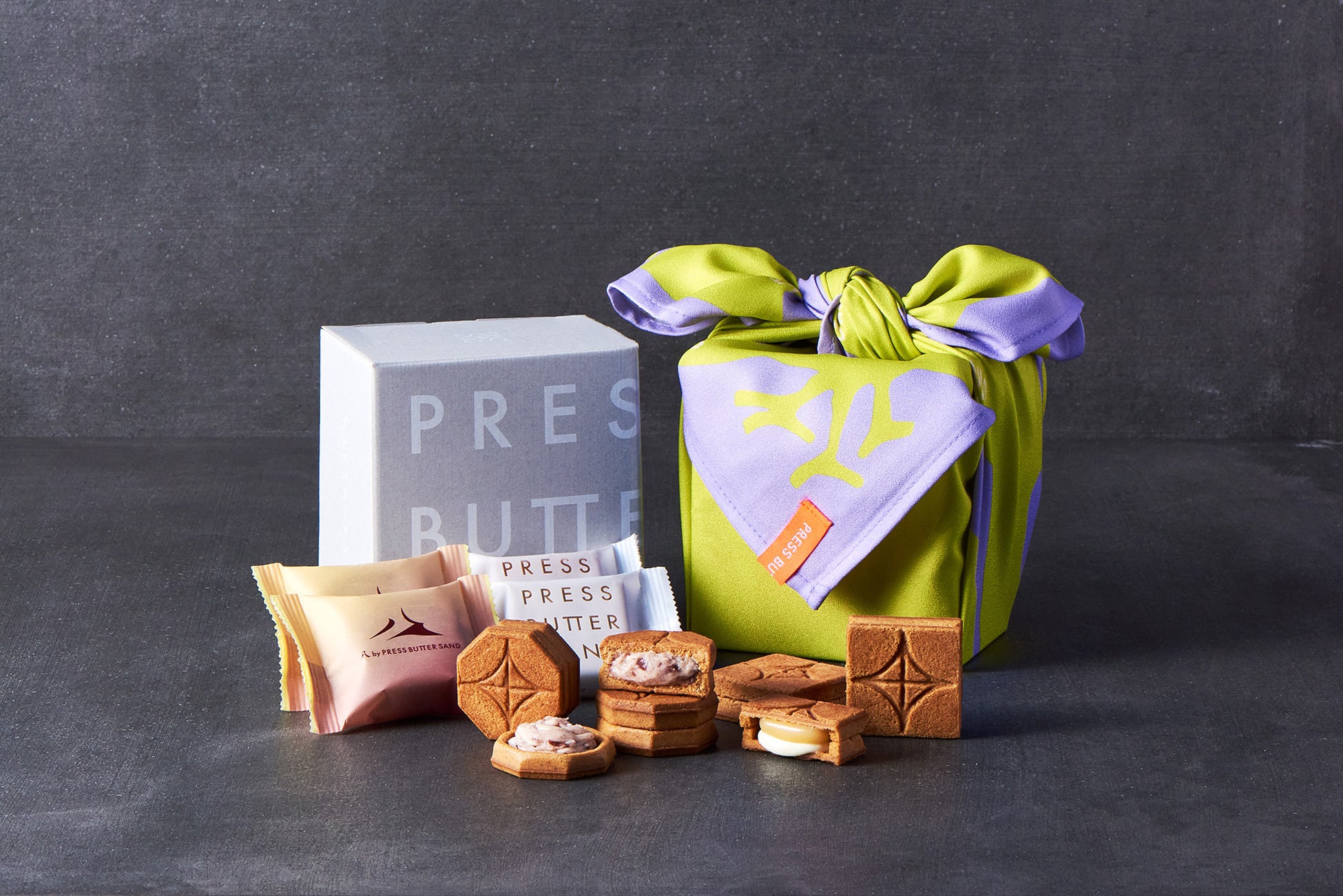 「八 by PRESS BUTTER SAND」と「PRESS BUTTER SAND」のそれぞれの代表商品である「和バターサンド〈きな粉あずき〉」と「バターサンド」を詰合せたボックスを限定デザインの風呂敷でお包みしました。