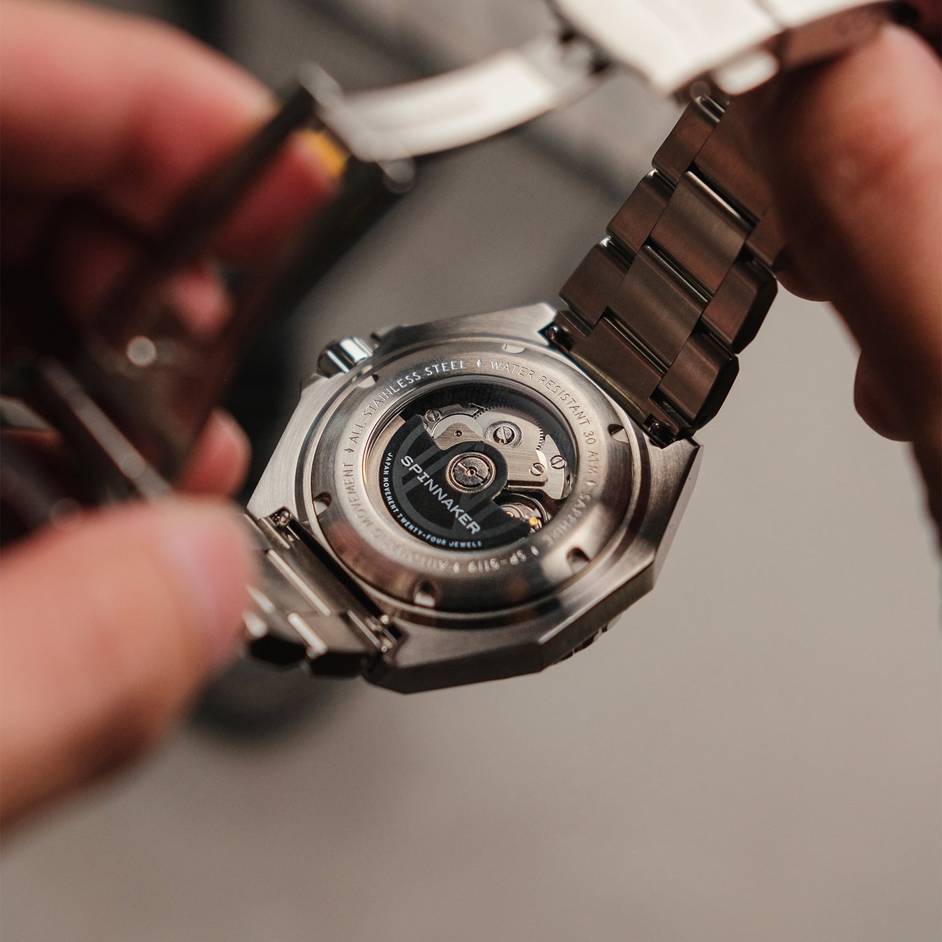 心臓部にあたるムーブメントは、NH34 GMT自動巻きムーブメント。信頼の日本製で、精度にも優れます。シースルー仕様の裏蓋から、その精巧な動きを楽しめます。