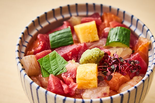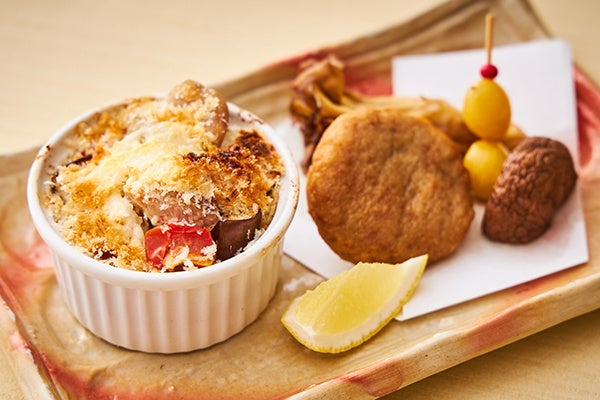 富山・石川・福井県産の恵みをさまざまな調理方法でご堪能いただける、ランチ限定のメニューです。八寸では、福井県産の“へしこ”をクリームチーズとクラッカーと一緒に、そのまま召し上がっていただけるように串にした一品や、エリンギを巻いて梅ペーストでさっぱりお召し上がりいただける富山県産“とやまポーク”をご用意いたします。揚物は石川県産の“加賀れんこん”をすりおろし、海苔を混ぜた衣で揚げる磯部揚げにすることで、モチモチの食感をお楽しみいただけます。福井県産の“とみつ金時”は相性のよい味噌を使ってグラタン仕立てにしました。グラタンの中には同じく福井県産の柔らかくジューシーな味わいの銘柄鶏“越前鶏”やきのこが入っており、様々な素材をご堪能いただけます。食事では、福井県産“ふくいサーモン”、石川県産”ゴマフグ“の昆布締め、北陸産”甘海老“、鮪を使った色鮮やかな「海鮮丼」をご賞味ください。