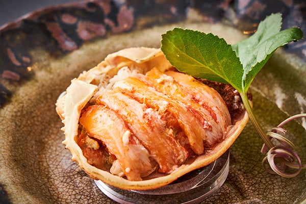 会席の最初に提供される一品は、石川県で獲れたズワイガニの雌“香箱ガニ”です。外子(そとこ)と呼ばれるつぶつぶの卵、味噌の部分であるオレンジ色の内子(うちこ)をたっぷり抱え、小さいながらも濃厚な味わいをお楽しみいただけます。お造りは、その時々に厳選した北陸産の魚介をご用意いたします。日本海で育まれた新鮮な魚介をご堪能ください。進肴では、本来鯨肉と水菜を使った鍋料理「はりはり鍋」を、風味豊かできめ細かい柔らかな肉質が特長の富山県産銘柄豚“とやまポーク”にてご提供します。福井県名物“大判揚げ”も一緒にご賞味ください。食事は2種類からお選びいただけます。「越前おろしそば」は黒っぽくやや太めの田舎そばに、薬味の大根おろし、ネギ、かつお節をのせ、出汁をかけて食べる福井県のソウルフードです。「へしこ茶漬け」の“へしこ”は、魚を塩漬けにし米ぬかに長期間漬け込んで熟成させる伝統料理です。お茶漬けにすることで塩加減が薄まり、へしこの脂が溶けだして絶妙な味になります。デザートでは、しっとりほくほくした味わいで、とろける甘さが特長の福井県産さつまいも“とみつ金時”のモンブランと、旬の柿といちじくを合わせたゼリーを堪能いただけます。始まりから終わりまで随所に北陸地方の素材を感じていただける会席です。