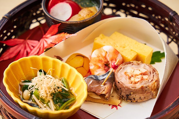 鯖奉書寿司 麩の辛し和え 柿玉子 紅葉蓮根 海老銀杏餅