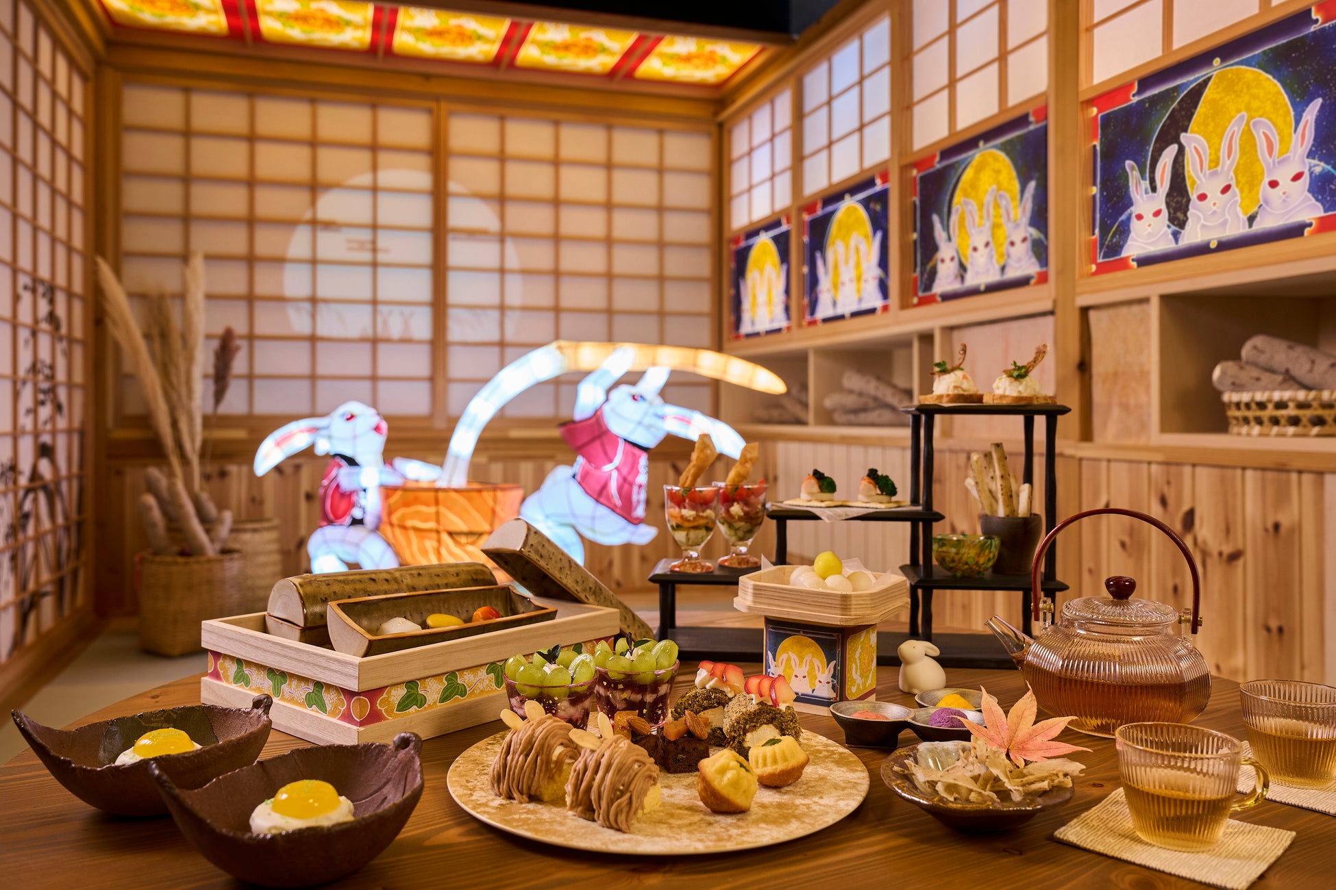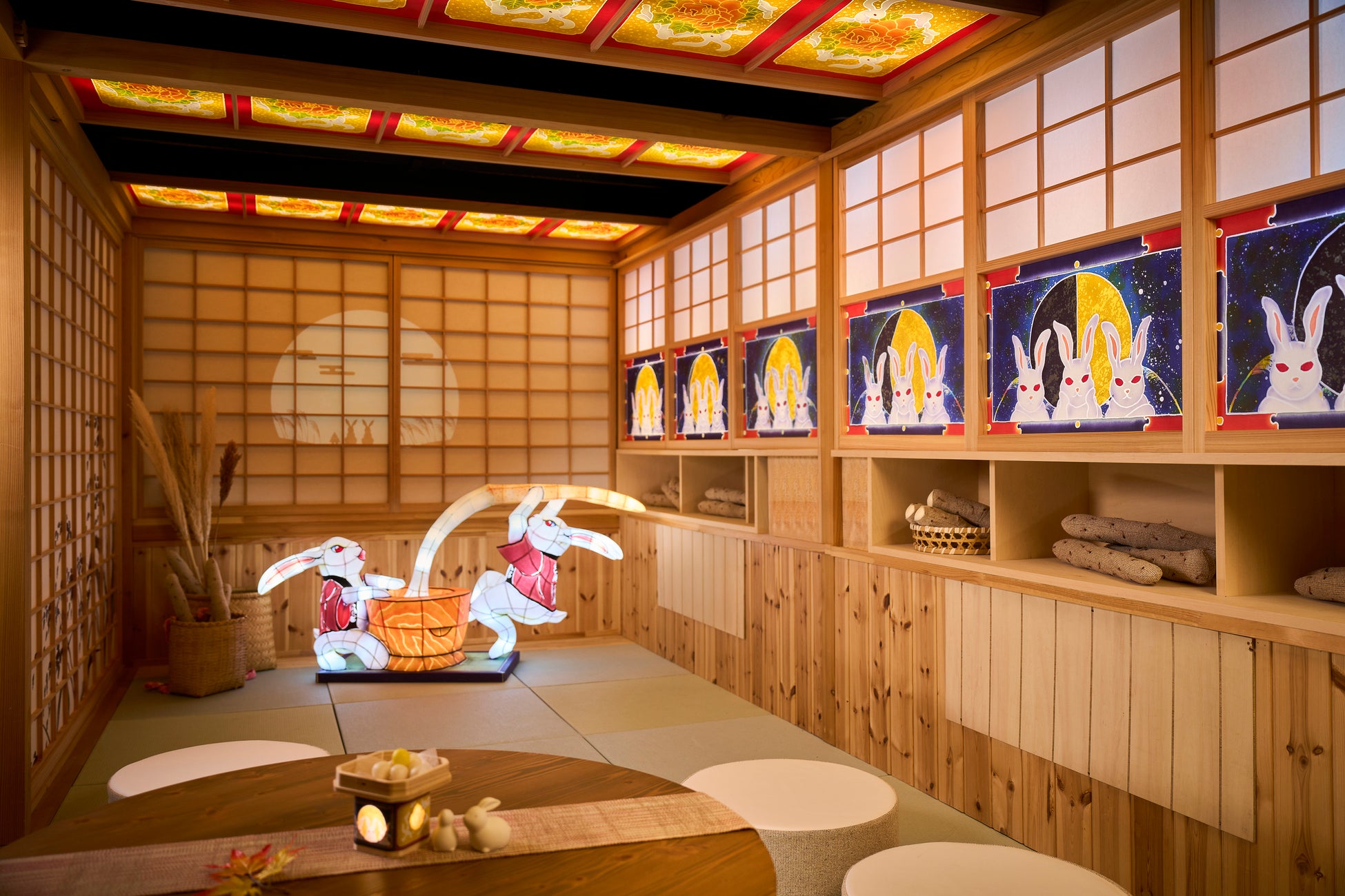 アフタヌーンティーの会場は、ゆったりとお月見を楽しめるように特別に設えたプライベート空間「お月見ねぷたの間」です。室内には、まるい満月の灯りとともに、うさぎの灯篭が優しく灯ります。壁と天井を彩るうさぎのモチーフはねぷた表現師・忠汰氏による描き下ろしデザインで、雅な雰囲気を醸し出します。また、長芋で餅つきをし、おもてなしをするユニークな姿のうさぎのねぷたも見所です。満月の灯りに照らされた空間で、うさぎとともに月を眺め、寛ぎのひとときを過ごせます。