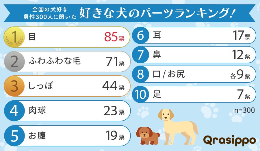 今回は事前調査で「犬が好き」と回答した全国の犬が好きな男性300人を対象に『好きな犬のパーツ』についてアンケートを実施。