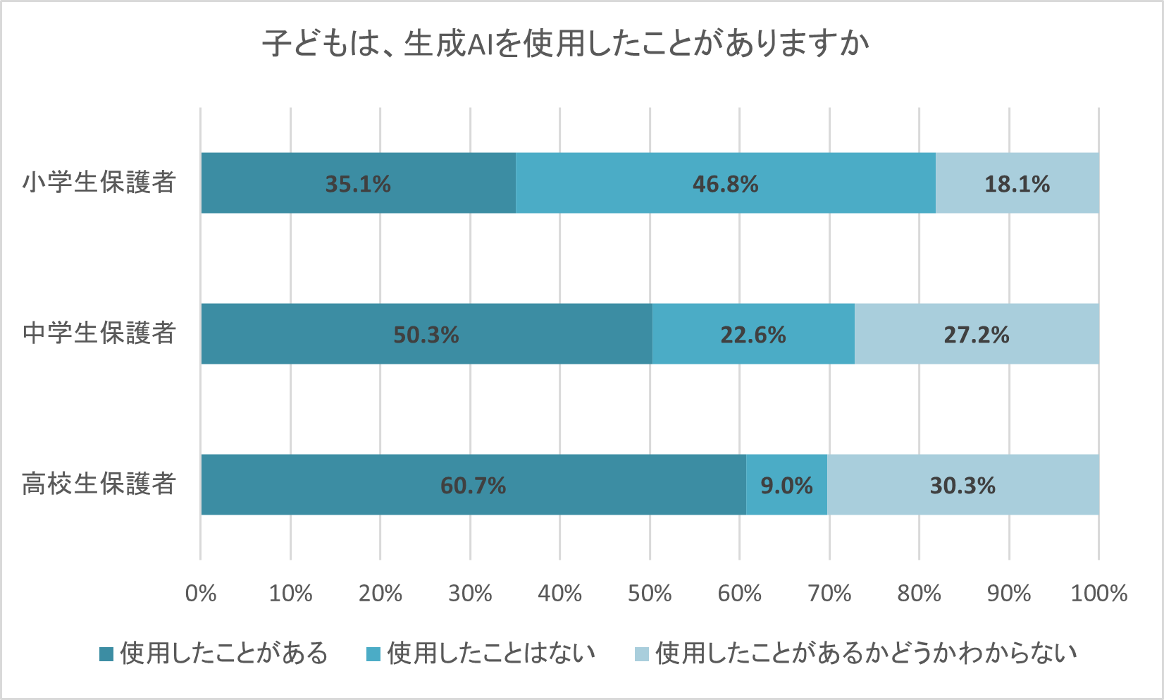 保護者自身が生成AIを使用したことがあるかについては、小学生保護者の71.4%、中学生保護者の63.3%、高校生保護者の56.4%が「使用したことがある」と回答した。2023年に実施した調査において、「使用したことがある」と回答した割合は、小学生保護者31.6%、中学生保護者22.5%、高校生保護者17.6%であり、使用経験がある保護者が顕著に増加していることが分かった。生成AIを使用した場面では、仕事での使用が全体の約60%、プライベートでの使用が全体の約75%だった。