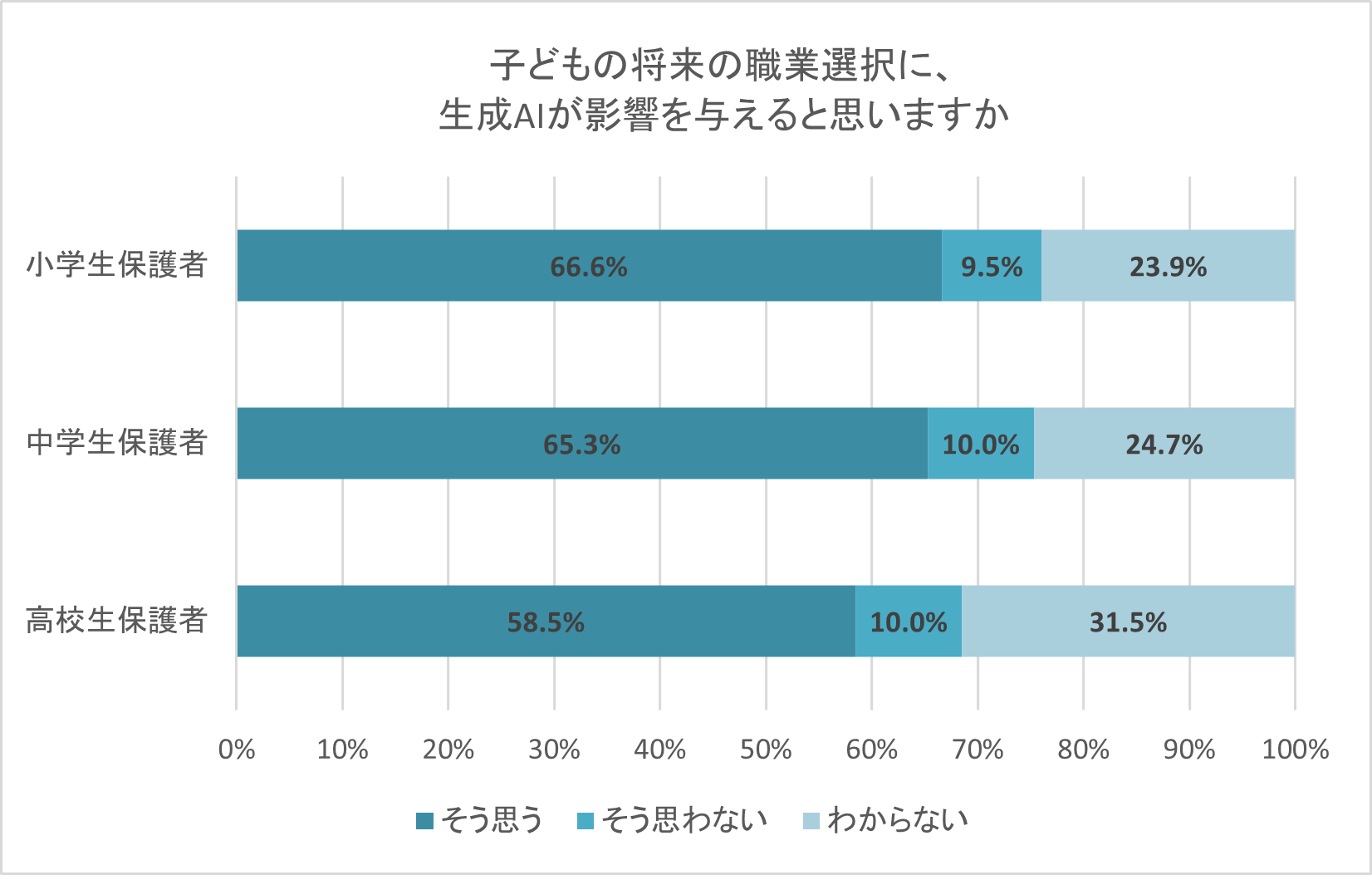 子どもの将来の職業選択に、生成AIが影響を与えていると思うかという質問に対しては、小学生保護者の66.6%、中学生保護者の65.3%、高校生保護者の58.5%が「そう思う」と回答した。