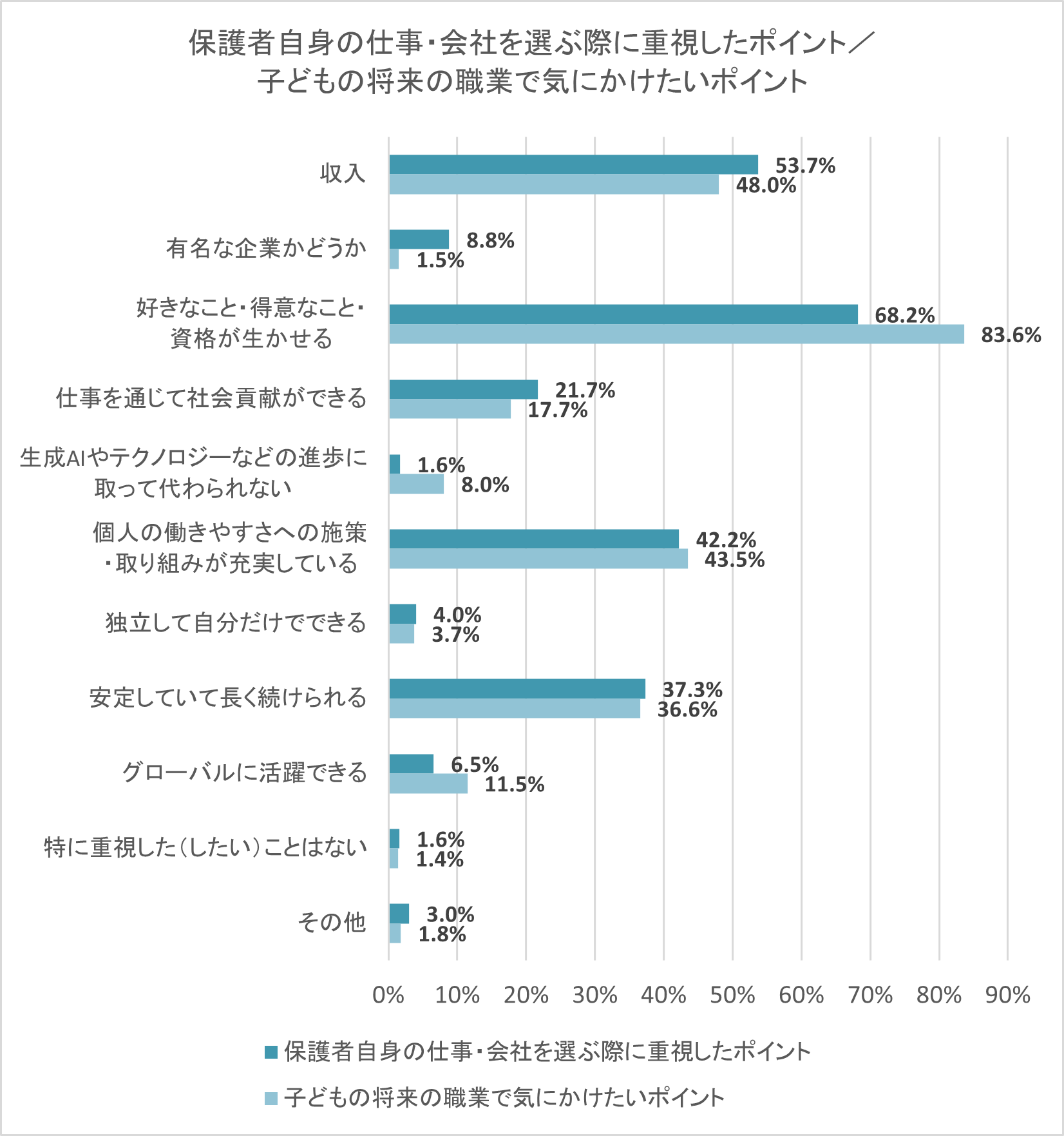「保護者自身が今までに就いたことがある仕事・会社を選ぶ際に重視したポイント」および「将来子どもが就く職業について、保護者として気にかけたいポイント」を聞いた。