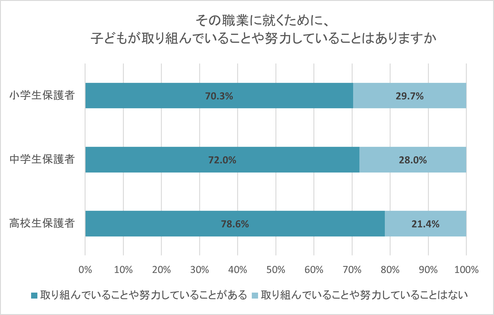 子どもには将来就きたい職業が「ある」と回答した保護者に、その職業に就くために、子どもが取り組んでいることや努力していることがあるかを聞いた。小学生保護者の70.3%、中学生保護者の72.0%、高校生 保護者の78.6%が「取り組んでいることや努力していることがある」と回答した。将来就きたい職業がある子どもは、その目標に向かって努力する傾向が大きいことが分かった。