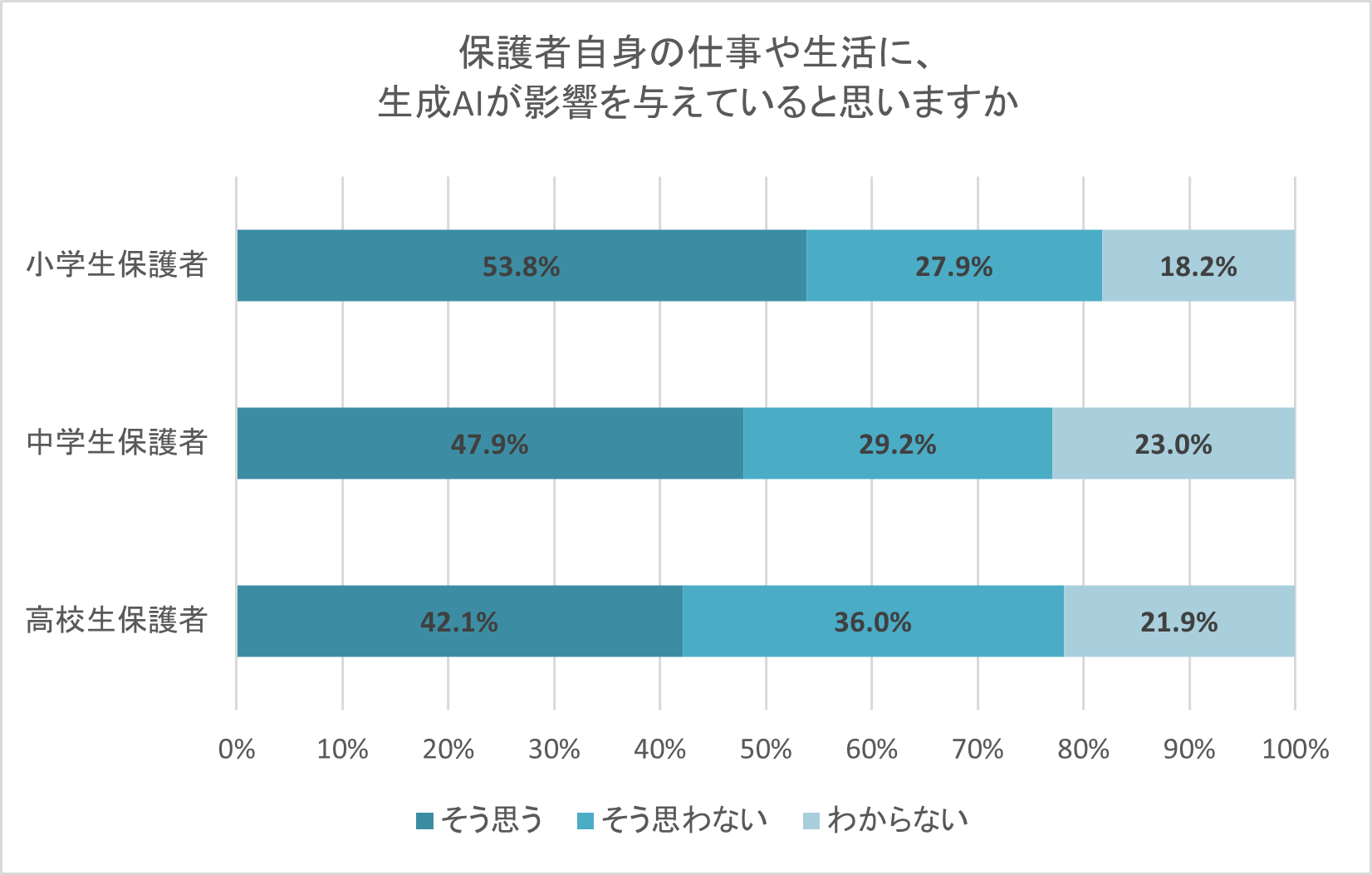 保護者自身の仕事や生活に、生成AIが影響を与えていると思うかという質問に対しては、小学生保護者の53.8%、中学生保護者の47.9%、高校生保護者の42.1%が「そう思う」と回答した。2024年に実施した調査では、小学生保護者・中学生保護者・高校生保護者のいずれも、「そう思う」と回答した割合よりも「そう思わない」と回答した割合が高かった。この1年で、生成AIがより身近になっていると考えられる。