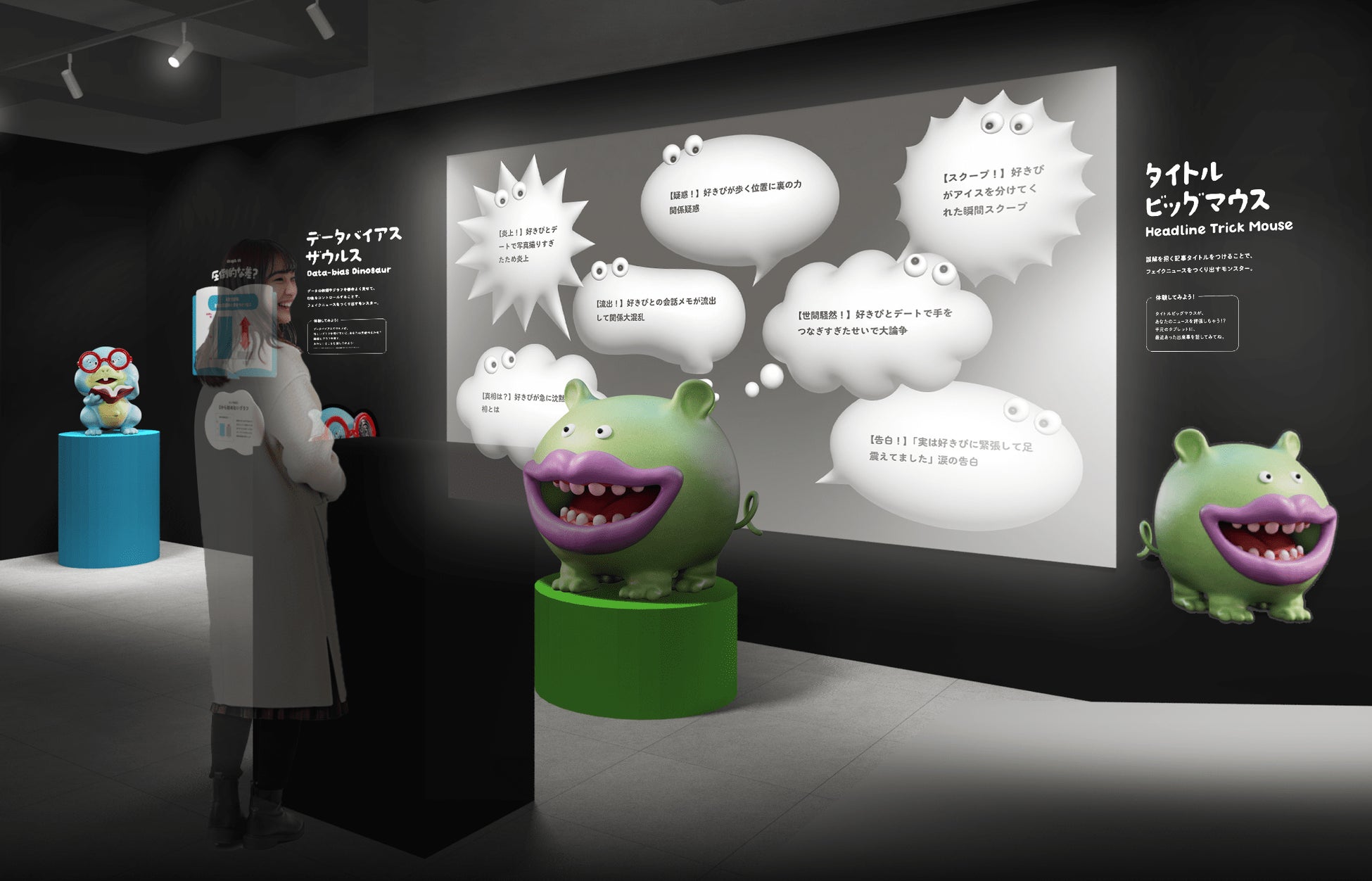 データの数値やグラフを都合よく見せて、印象をコントロールすることで、フェイクニュースをつくり出すモンスター。 印象的なグラフに隠されたうそを見抜くクイズ形式の展示です。