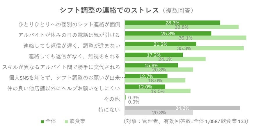 ・シフト調整の連絡におけるストレスの内訳は、1位「一人ひとりに対し、個別にシフトの連絡を取るのが面倒」、2位「アルバイトが休みの日に電話をするのは気が引ける」、3位「連絡してもアルバイトからの返信が遅く、調整が進まない」となった