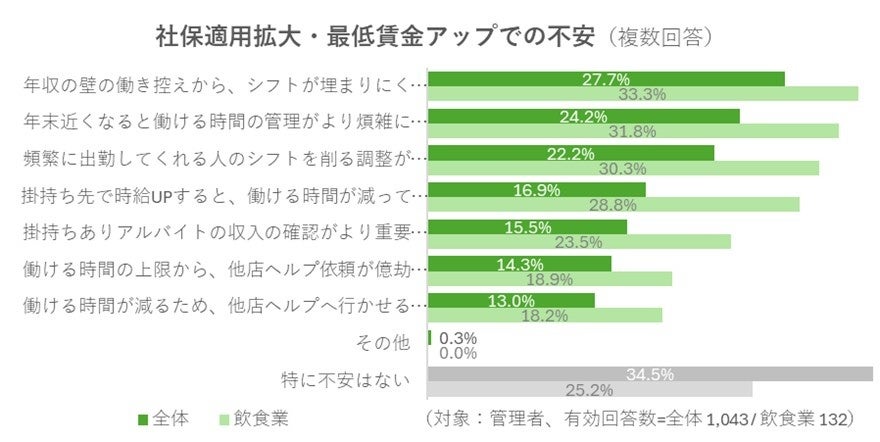 ・シフト調整の悩み3位に「年末の年収の壁」問題がランクインする中、10月からの「社会保険適用拡大」や「最低賃金アップ」について聞いたところ、全体の65.5%、飲食業では74.8%が関連する不安を感じていることがわかった
