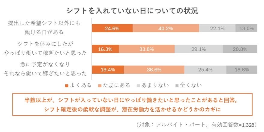 半数以上が「休みの日にやっぱり働きたい」と思った経験あり。シフト確定後の調整が潜在労働力を活かすカギに