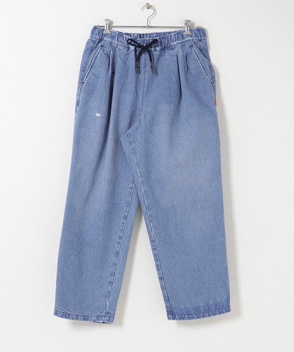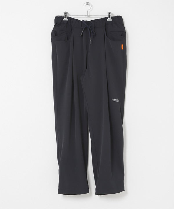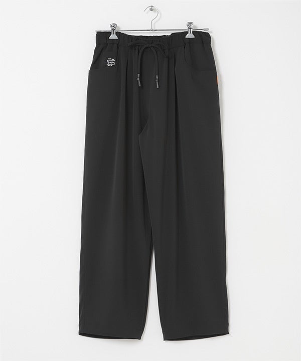 SEE SEE定番シルエットのワイドシルエットのイージーパンツ。素材は強撚ポリエステル糸とムラ感を出すThick&Thinタイプの糸を使用した新感覚の合繊素材。イージーケア性はもちろんのこと、ドライタッチと適度なストレッチ感を持ち、ウールのように上品な見えることも特徴の素材です。