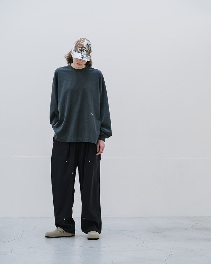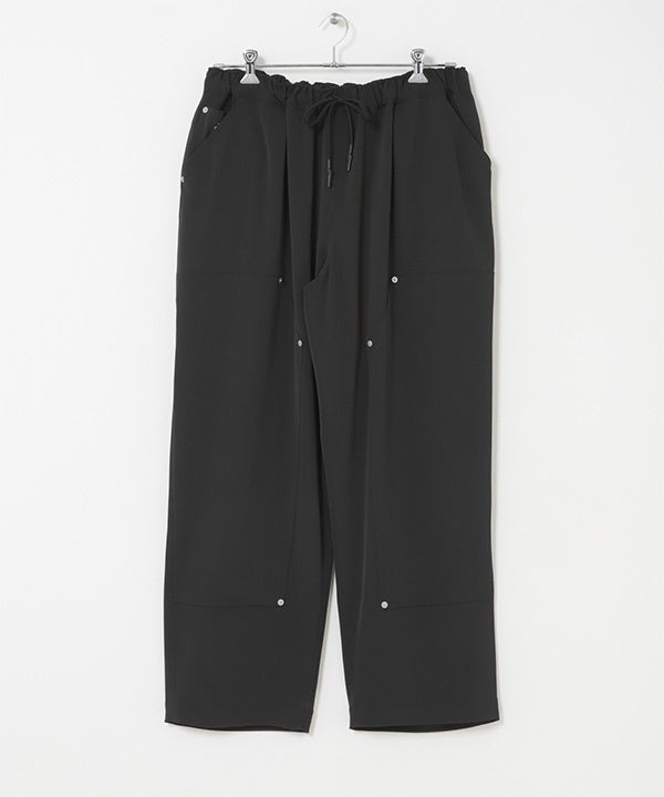 ダブルニー仕様や、ハンマーループ、ツールポケットなどのワークパンツのディテールを取り入れたバギーシルエットのダブルニーパンツ。素材は強撚ポリエステル糸使いのカルゼ素材を使用。優れた伸縮性と独特なドライタッチ感が特徴で、シルエットが綺麗に見える適度な落ち感のある素材です。