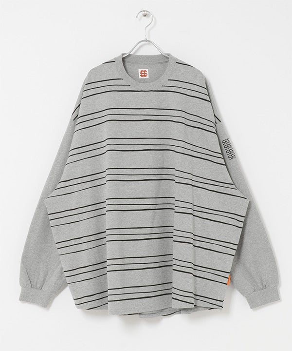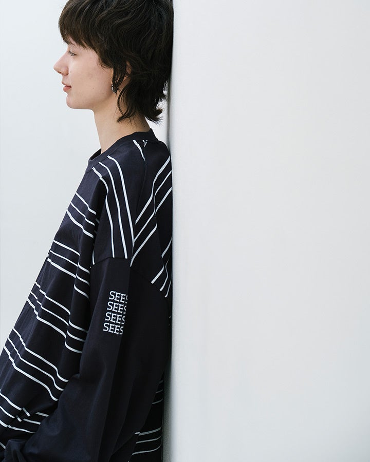 NEWデザインのボーダーパターンを施したSEE SEE定番のビッグシルエットのROUND LS TEE。素材は30SのMVS(毛羽の少ない糸)を使用し引き揃えて編む事でハリ感を持たせた、しっかりとした厚手の天竺です。