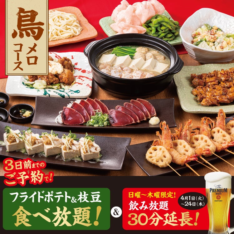 【三代目 鳥メロ】新生活応援キャンペーン対象宴会コースが3日前の予約で30分無料延長に!