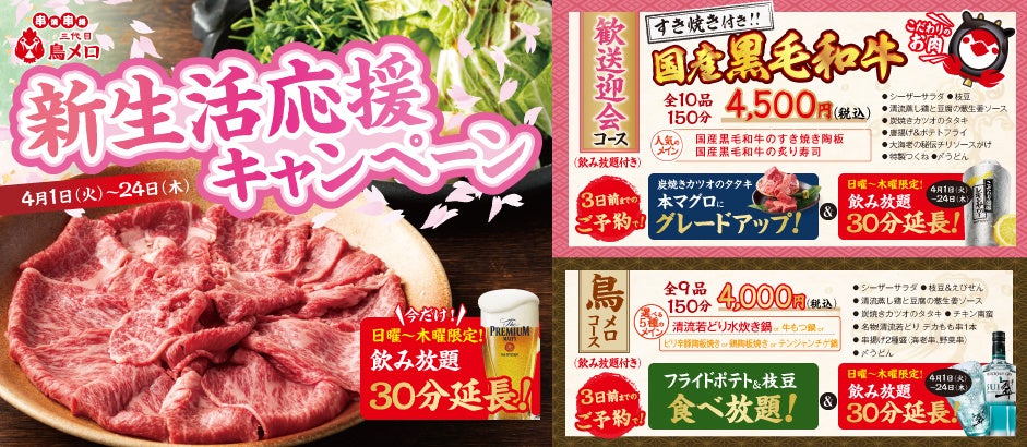 ワタミ株式会社(本社:東京都大田区、以下ワタミ)は、101店舗を展開する居酒屋業態「三代目 鳥メロ」(以下 鳥メロ)において、店舗限定で新生活応援キャンペーンを実施いたします。3日前のご予約で「歓送迎会コース」は炭焼きカツオのたたきから本マグロにグレードアップ+飲み放題が30分延長になり3時間のコースとなっております。「鳥メロコース」はフライドポテト&枝豆食べ放題+飲み放題30分延長がついて3時間の飲み放題付きです。歓送迎会コースは、国産黒毛和牛のすき焼き陶板と国産黒毛和牛の炙り寿司をメインとした大切な会にはピッタリのコースとなっております。4月は多くの人と会話が弾む時期になります。是非ゆっくり時間を過ごしていただきたく今回のキャンペーンを実施いたしました。この機会に是非鳥メロでの宴会をお楽しみください。