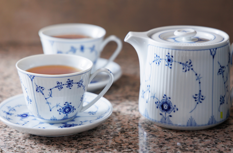ティーセットは、数あるロイヤル コペンハーゲンのコレクションの中から熟練の職人による手描きのブルーの模様が特徴の「ブルーフルーテッド プレイン」コレクションを中心に使用いたします。メニューはロイヤル コペンハーゲンの生誕地デンマーク産チーズを使ったスイーツをはじめ、地元奈良県産の旬の素材や新鮮なフルーツを色どりよく合わせ、美しい器に映える見た目にも涼しげなメニューをご用意いたします。