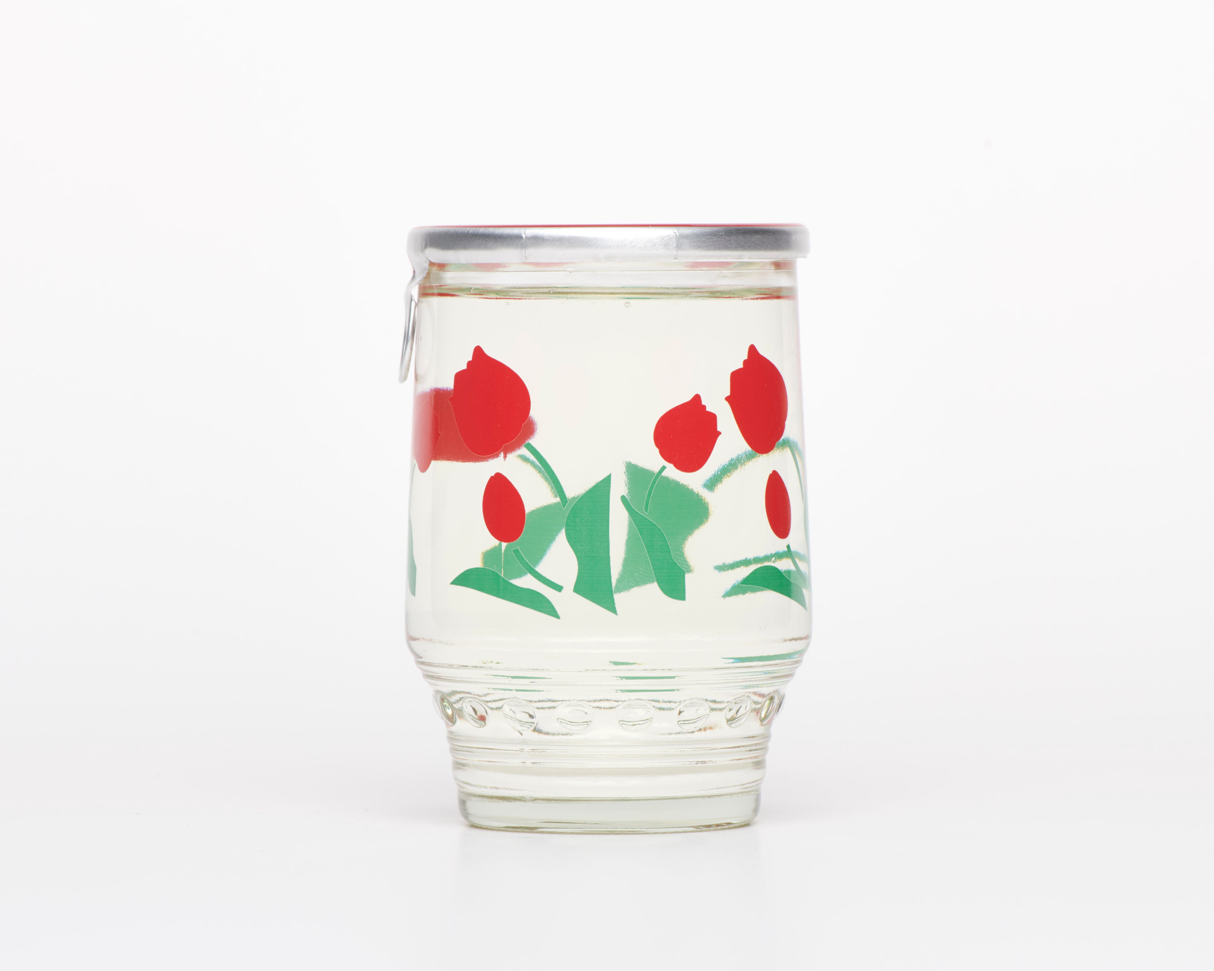 下がすぼまった形の瓶に、ワッペンのようなチューリップが描かれた可愛らしいデザイン。