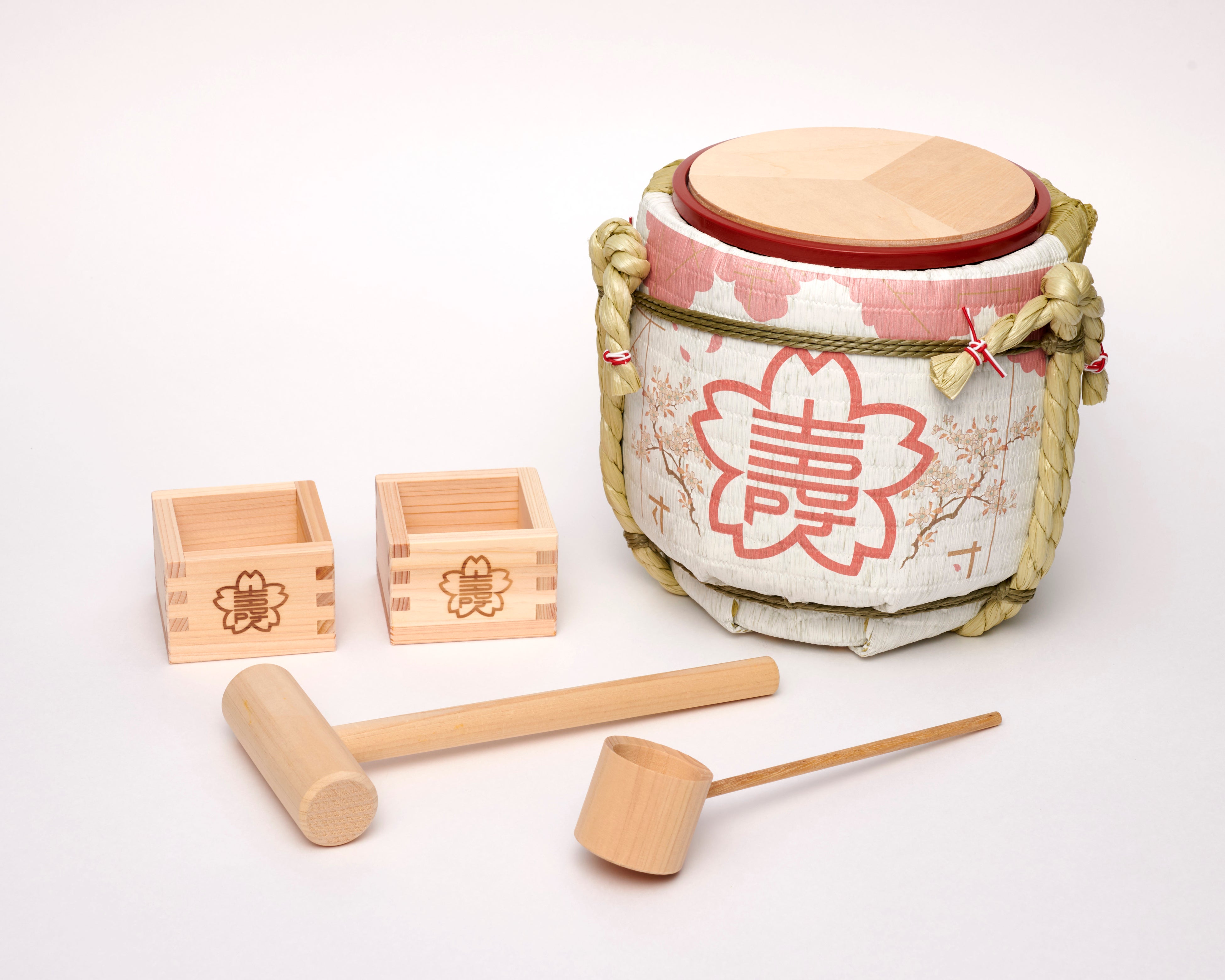 酒樽のふたをたたいて開ける「鏡開き」が気軽にできるセット。マグネットで装着された鏡板をたたくと板が跳ねて開けることができます。「HAPPY」の文字が隠されたデザインが特徴。