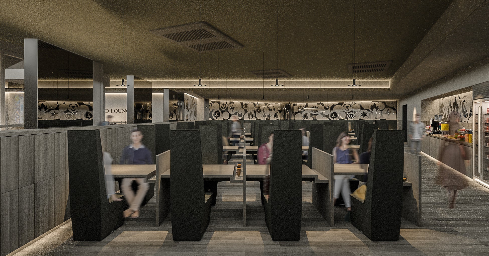 対戦の合間もゆったり過ごしていただけるよう、フリードリンク&フリースナックをご用意しております。ラウンジの壁面には、「基本エネルギー」のエネルギーマークなどがデザインされ、ポケモンカードらしさのあふれる特別な空間となっています。