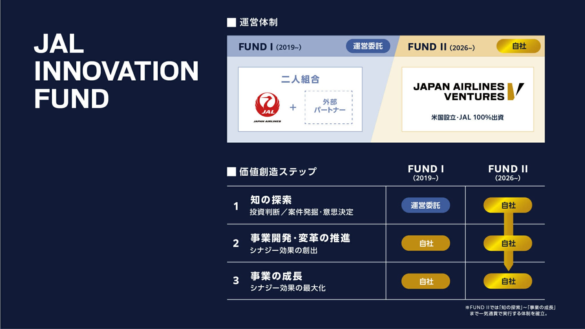 JALは、2019年より運営してきたコーポレート・ベンチャー・キャピタル(以下「CVC」)(*1)1号ファンド「JAL Innovation Fund」(*2)の取り組みをさらに進化させ、新たに2号ファンド「JAL Innovation Fund II」を設立します。これまで外部パートナーとの共同運営(二人組合)を通じて培ってきたノウハウやグローバルネットワークを基盤に、今後は投資判断から事業連携に至るまで一貫して自社で担う体制を確立します。