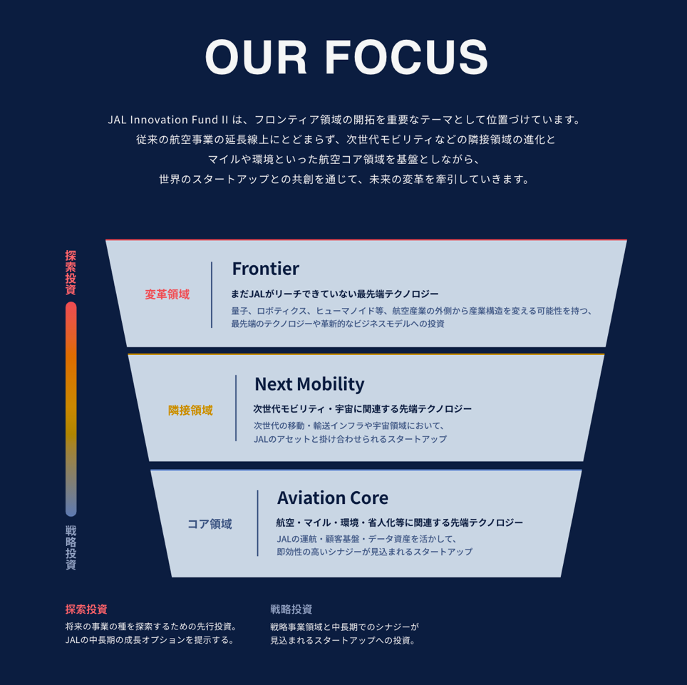 これまで、マイル・環境などの航空コア領域や次世代モビリティなどの隣接領域といった航空ドメインの進化に取り組んできましたが、2号ファンドの設立により、航空ドメインのさらなる進化を図りつつ、JALがまだリーチできていないフロンティア領域の開拓も積極的に推進します。未開拓のテクノロジーや革新的なビジネスモデルを探索・発掘し、優先的にリソースを投入することで、未来の変革を牽引していきます。