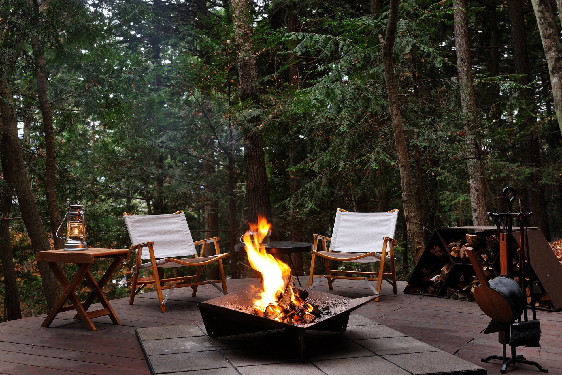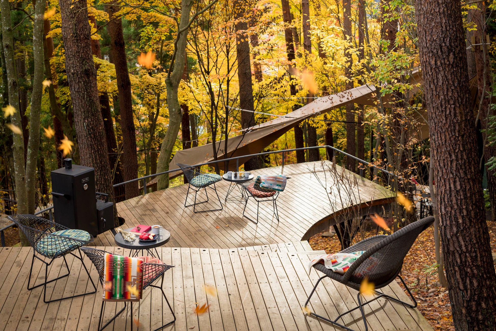河口湖を望む丘陵に溶け込むように建つ、日本初のグランピングリゾート* 。焚き火を眺めながら過ご