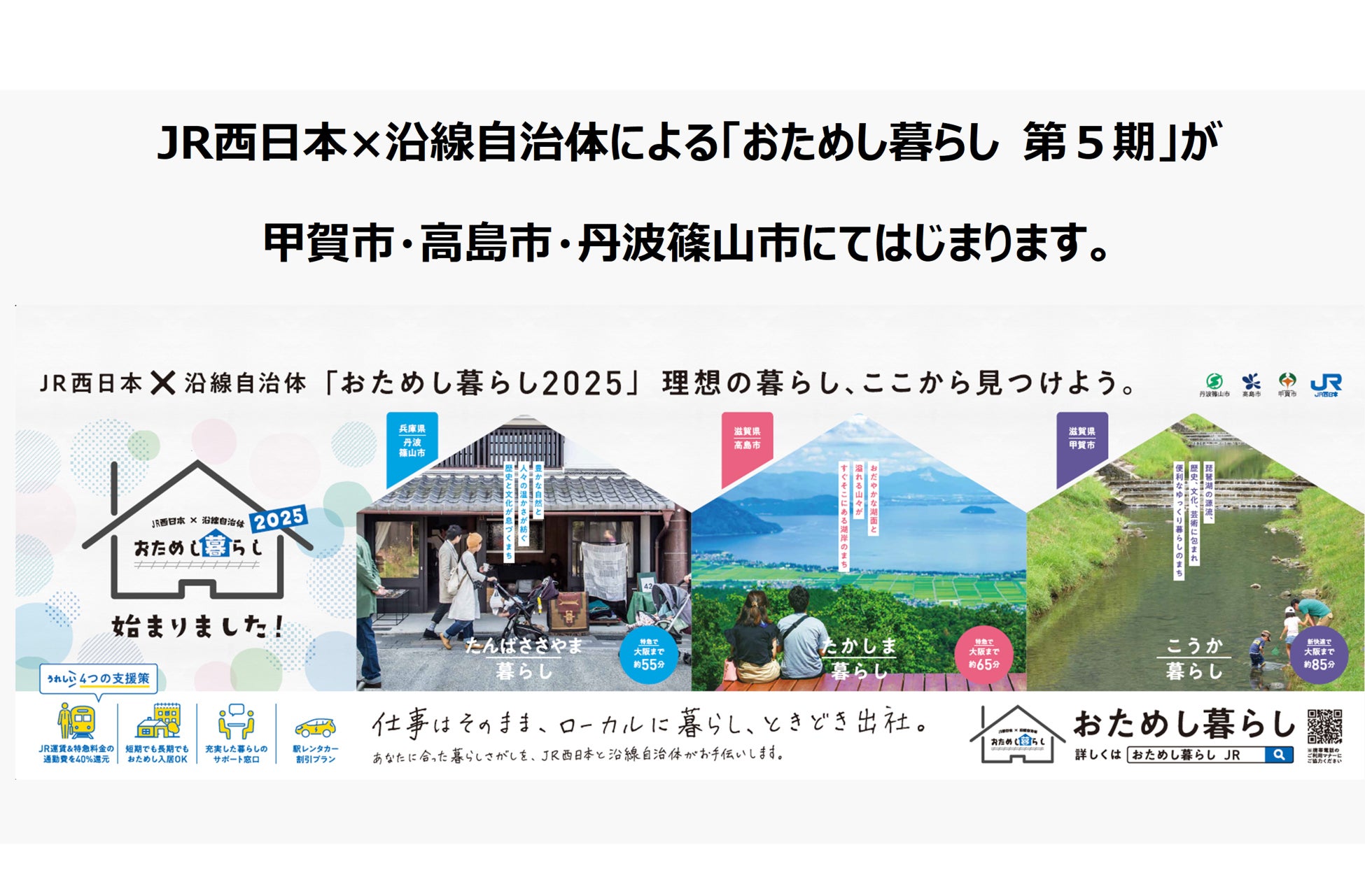 西日本旅客鉄道株式会社(本社:大阪府大阪市、代表取締役社長:長谷川 一明、以下「JR西日本」)は、沿線自治体の滋賀県甲賀市、滋賀県高島市、兵庫県丹波篠山市と協働し、 「おためし暮らし 第5期」を2025年4月より開始いたします。