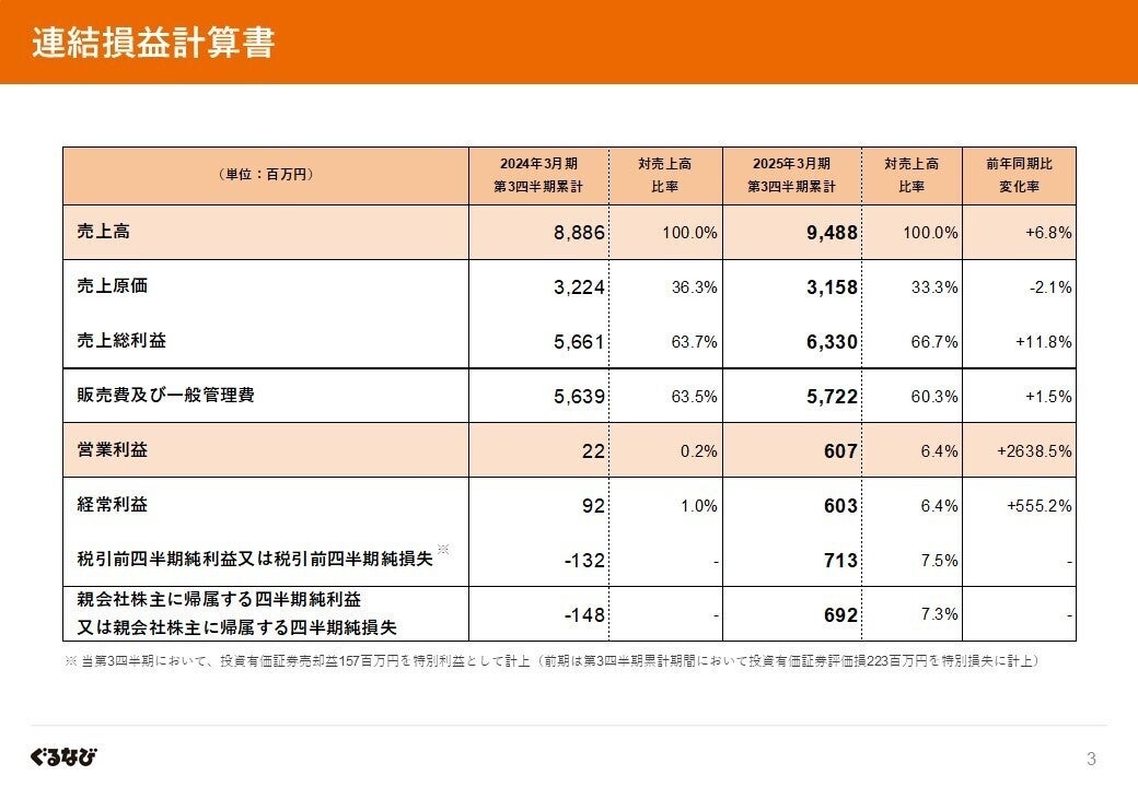 株式会社ぐるなび(本社:東京都千代田区、代表取締役社長:杉原章郎 以下、ぐるなび)は、2025年2月7日(金)に、2025年3月期 第3四半期決算を発表しました。