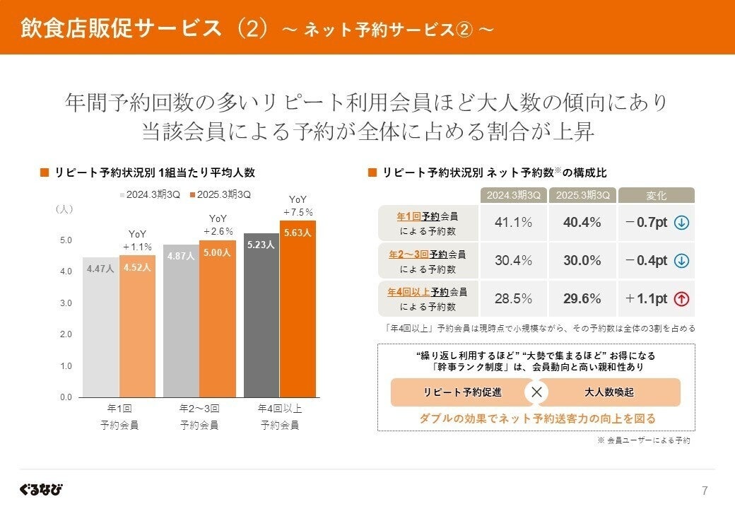 さらに、こうした「繰り返し、大人数で外食を楽しむ会員」による予約の全体に占める割合が増加しており、「楽天ぐるなび」サイトに対するロイヤリティの高い会員の存在感が高まりつつあります。