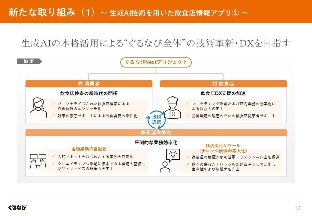 当社は、2024年8月に生成AI技術の徹底活用を推進する「ぐるなびNextプロジェクト」を本格始動し、提供サービスはもとより当社事業運営体制を含めた“ぐるなび全体”の技術革新に取り組んでいます。