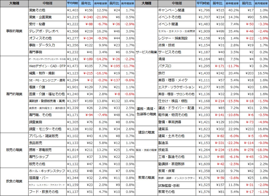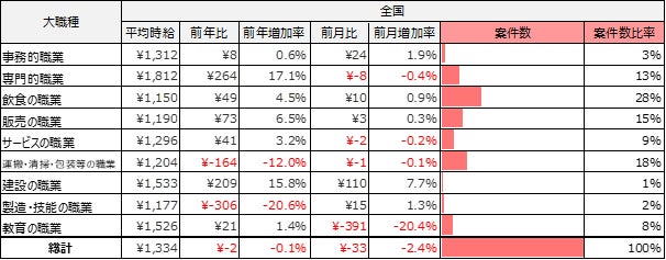事務的職業は1,312円(前年比8円増、前月比24円増)、専門的職業は1,812円(前年比264円増、前月比8円減)、飲食の職業は1,150円(前年比49円増、前月比10円増)、販売の職業は1,190円(前年比73増、前月比3円増)、サービスの職業は1,296円(前年比41円増、前月比2円減)、運搬・清掃・包装等の職業は1,204円(前年比164円減、前月比1円減)、建設の職業は1,533円(前年比209円増、前月比110円増)、製造・技能の職業は1,177円(前年比306円減、前月比15円増)、教育の職業は1,526円(前年比21円増、前月比391円減)となりました。