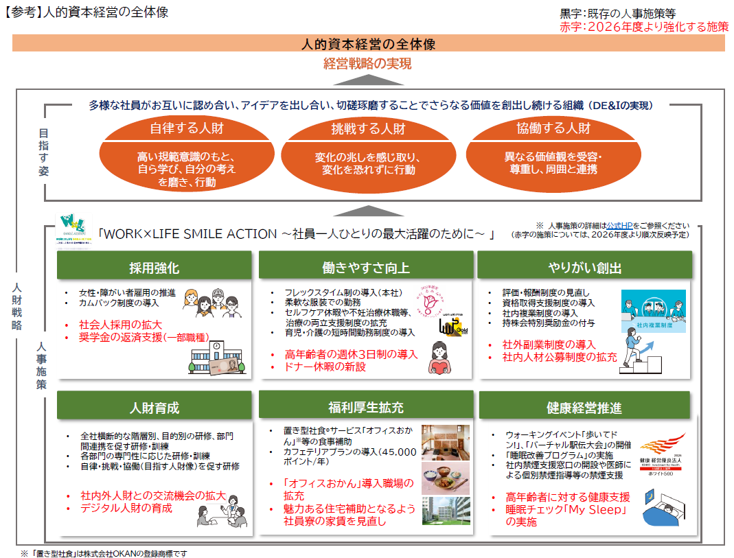 引き続き、人財戦略に掲げる「採用強化」「働きやすさ向上」「やりがい創出」「人財育成」「福利厚生拡充」「健康経営推進」の観点から実効性の高い施策を策定・実行していきます。