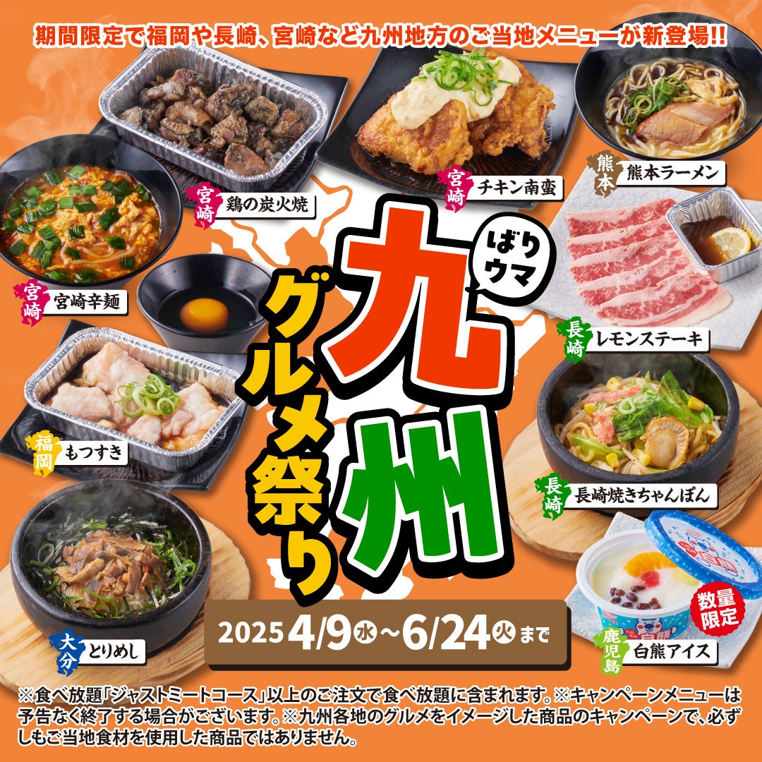 ワタミ株式会社(東京都大田区、以下ワタミ)と国内有数の和牛生産者であるカミチクグループ(鹿児島県鹿児島市)との合弁会社、ワタミカミチク株式会社(東京都大田区、以下ワタミカミチク)が展開する「かみむら牧場」は、2025年4月9日(水)から2025年6月24日(火)まで期間限定で、「九州グルメ祭り」として福岡や長崎、宮崎など九州地方のご当地メニューの提供をいたします。単品でのご注文もしくは、食べ放題「ジャストミート」コース以上で追加ラインナップとして対象メニューがご注文可能です。