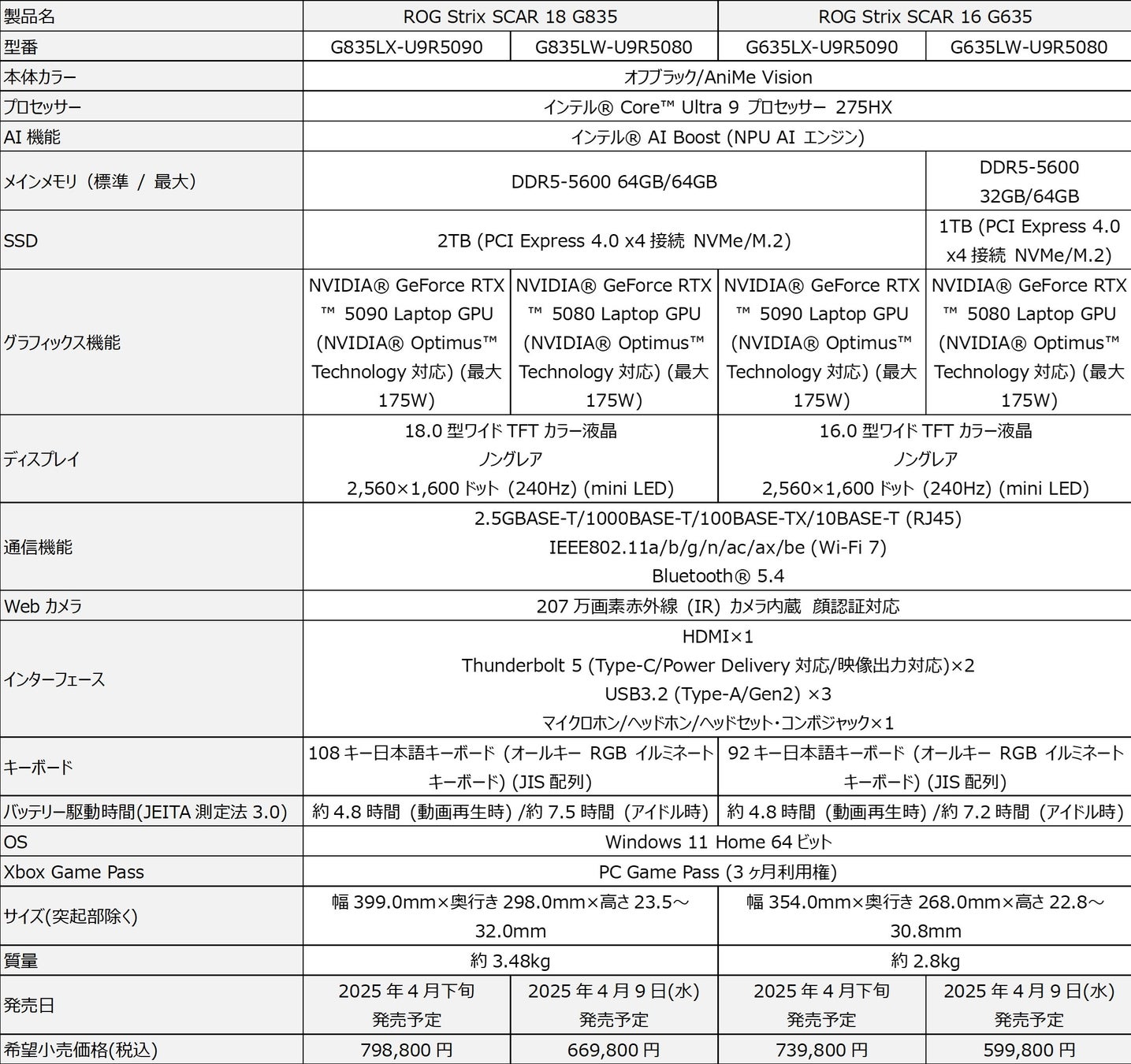 NVIDIA® GeForce RTX™ 5090 Laptop GPUを搭載した、「ROG Strix SCAR 18 G835LX」および「ROG Strix SCAR 16 G635LX」は本日より予約を開始し、4月下旬順次発売開始予定となり、「ROG Zephyrus G16 GU605CX」は本日より発売開始となります。またNVIDIA® GeForce RTX™ 5080 Laptop GPUを搭載した「ROG Strix SCAR 18 G835LW」および「ROG Strix SCAR 16 G635LW」、「ROG Zephyrus G16 GU605CW」は現在予約受付中となり、4月9日(水)に発売予定となります。