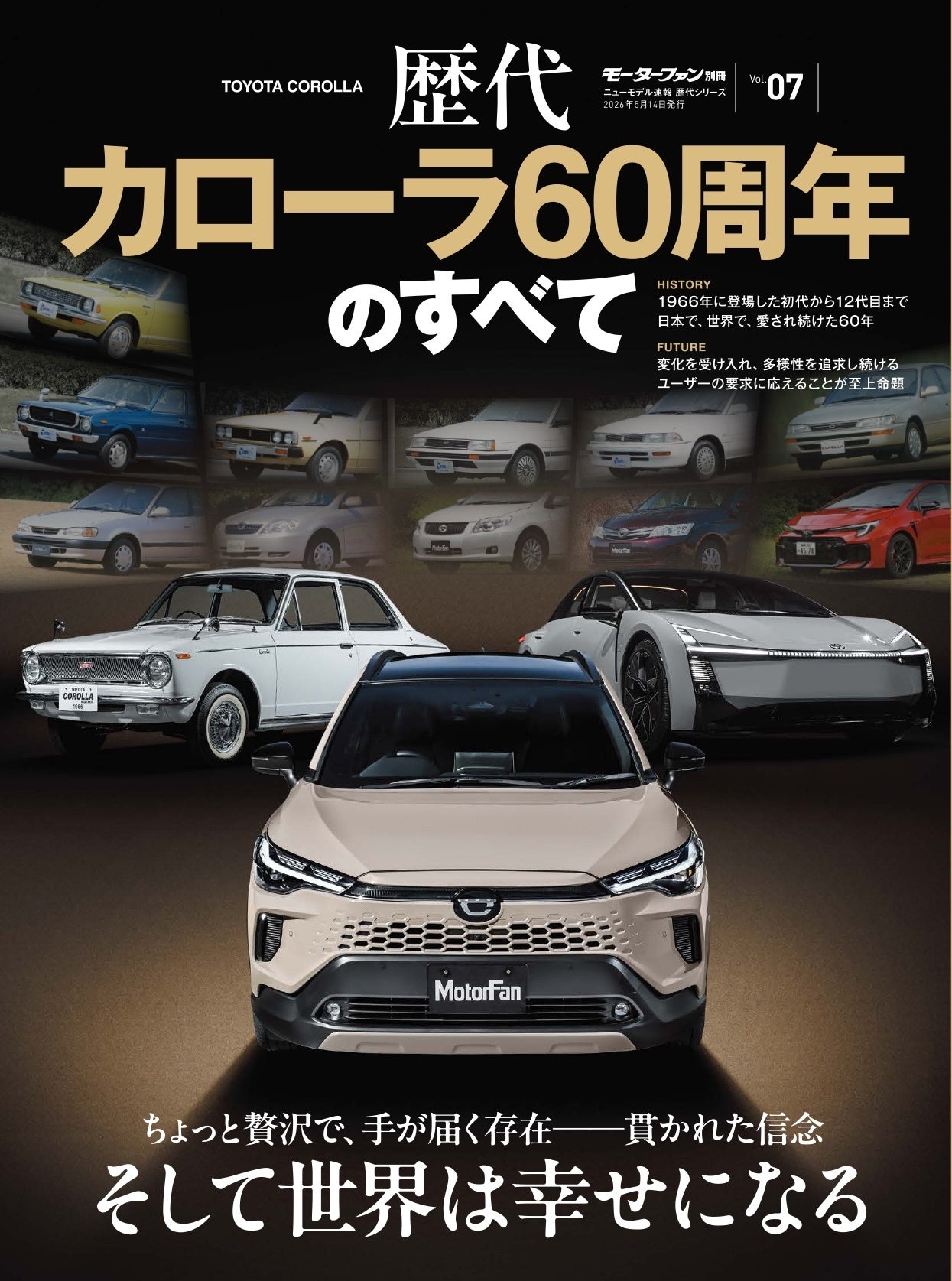 2026年、カローラは60周年を迎えます。登場以来、常にファミリーカーとしてその時々のニーズに応え続け、今や全世界での累計販売台数は5000万台を超えるまでに至りました。この本では、初代以来カローラがどのような意図を持って進化してきたのか、そして最新のカローラを、さらにはこれからカローラはどう変わっていくのかをインタビューや豊富な過去写真とともにお伝えします。