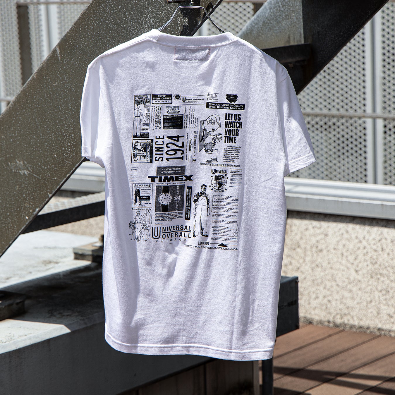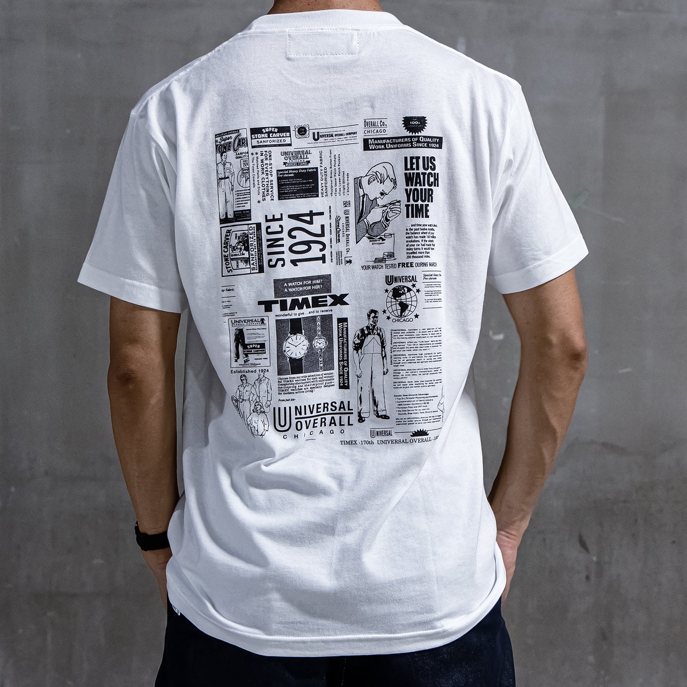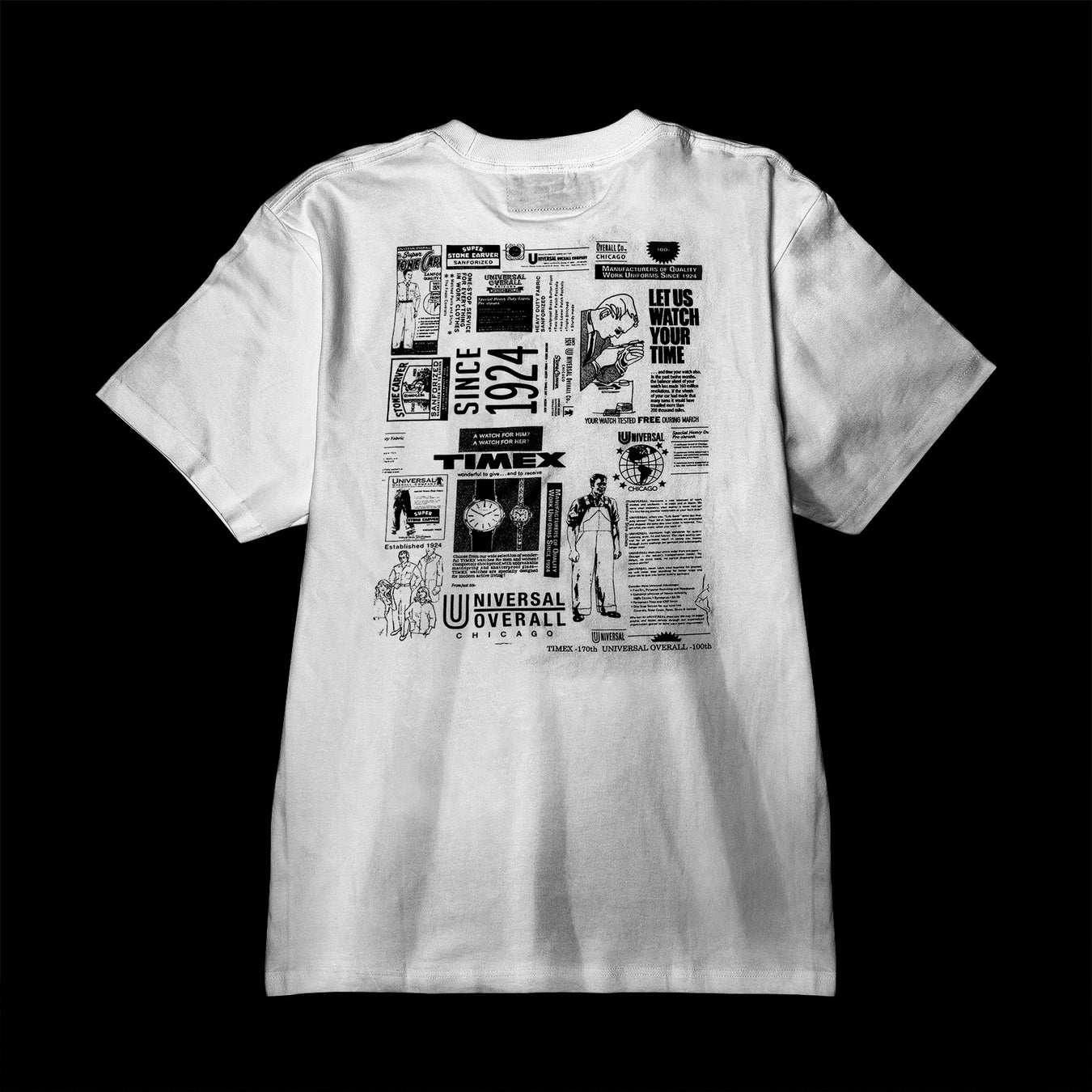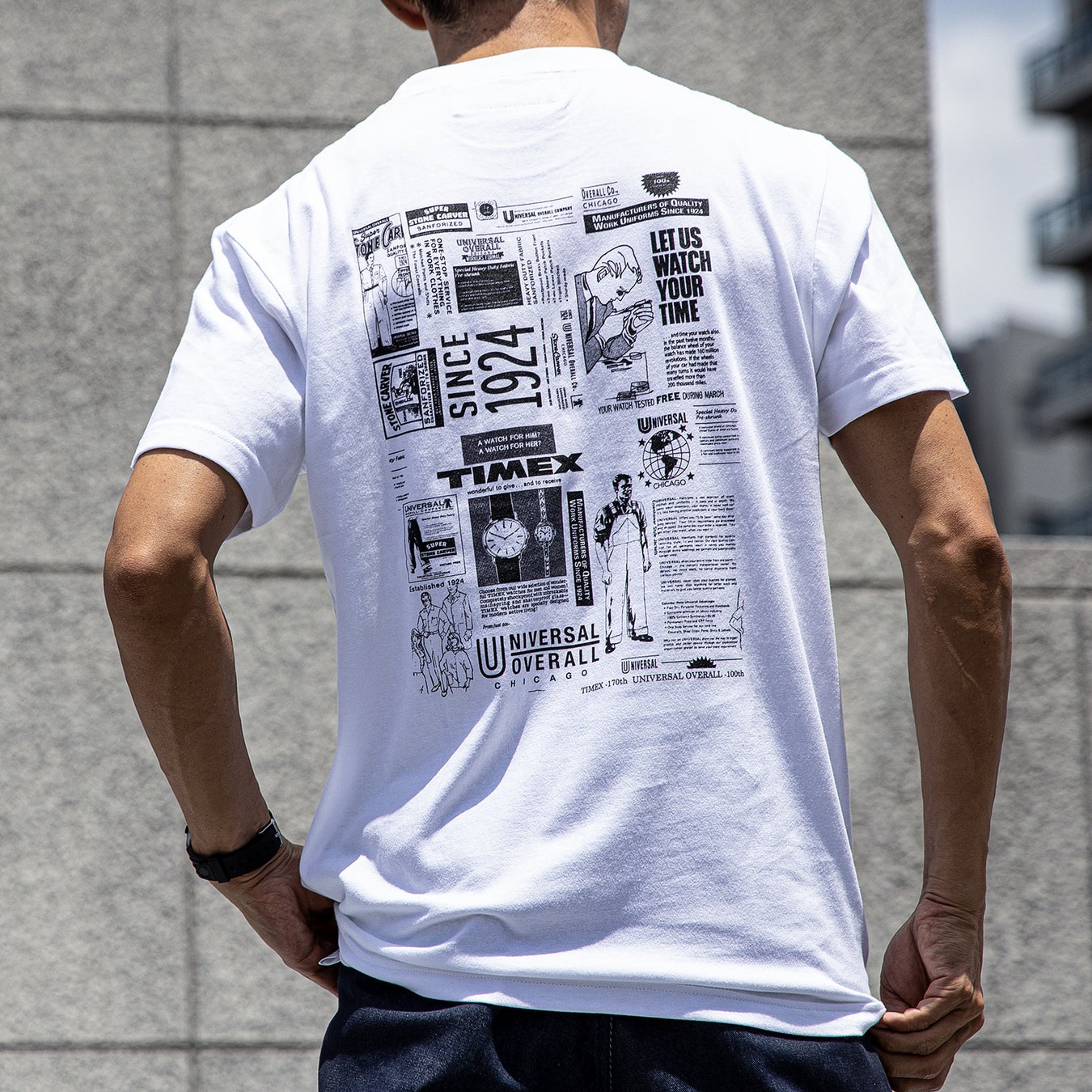 TIMEXとUNIVERSAL OVERALLの昔の広告などで使用されていたグラフィックをマッシュアップしバックプリントした1枚。TIMEXのグラフィックは、実際に使用されていた活版印刷の鉛の原板2枚から抽出した、珍しいグラフィックを採用。