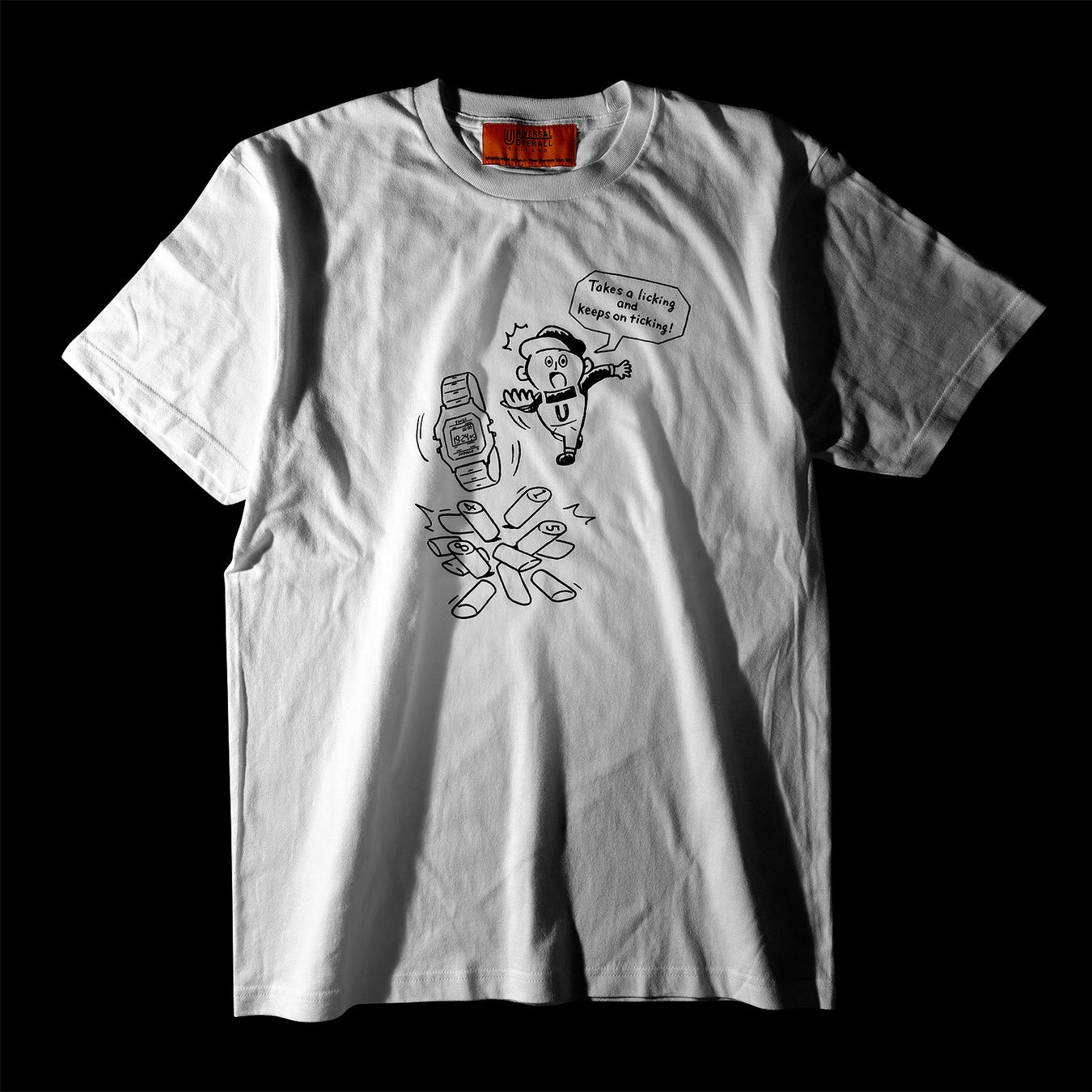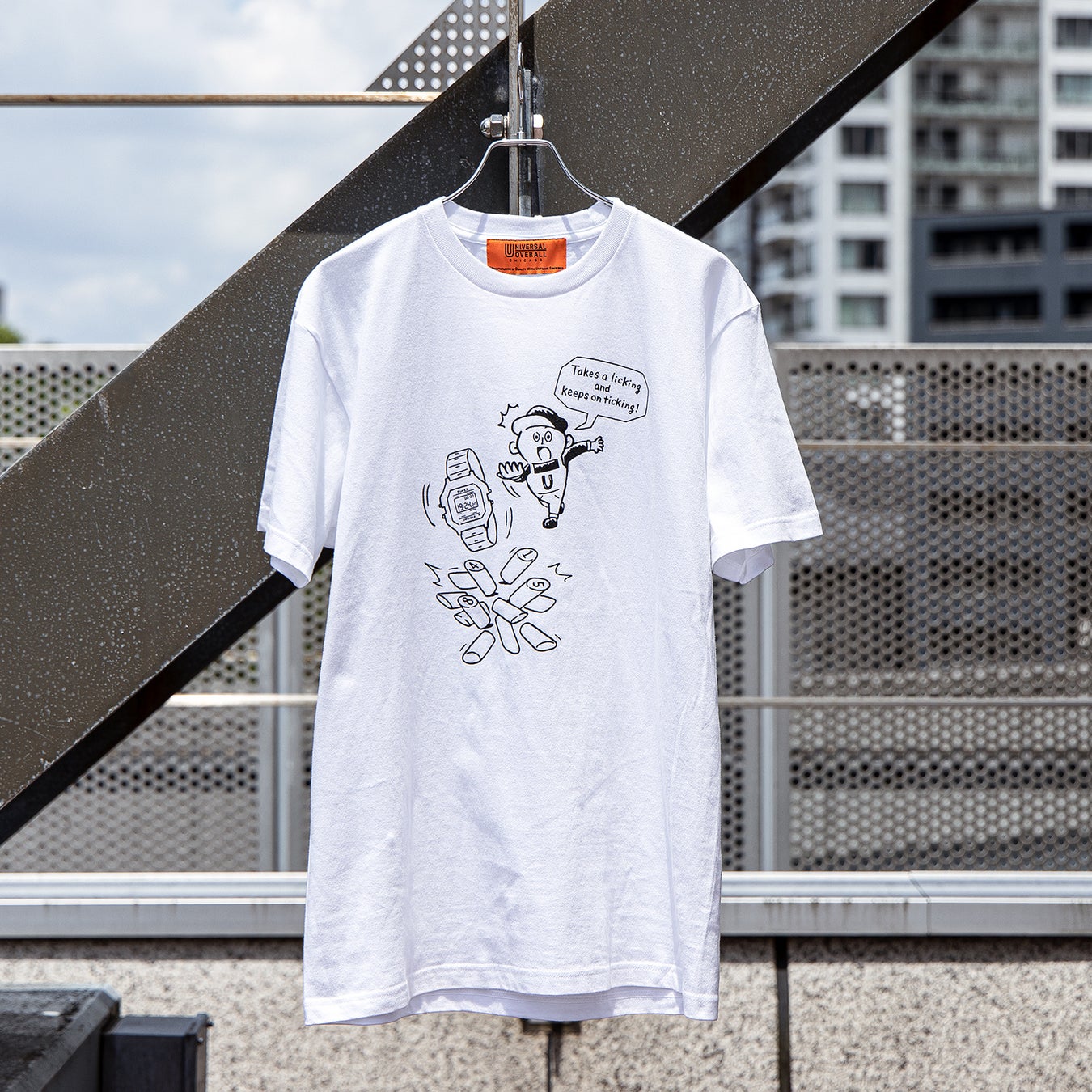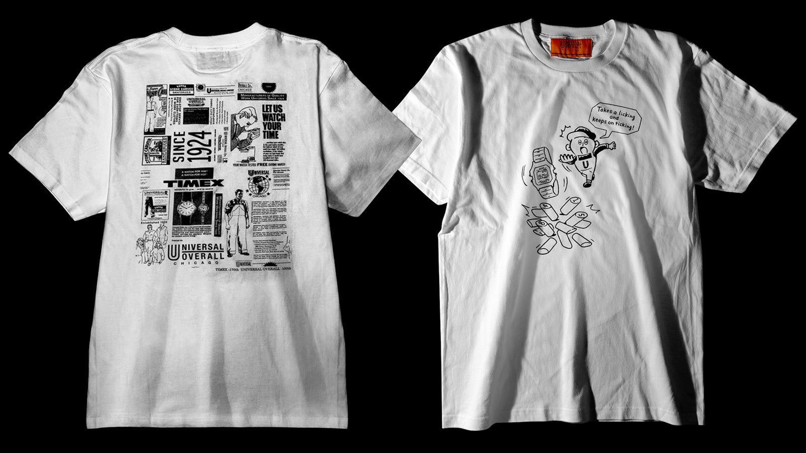 その両ブランドがお互いの周年を記念して、コラボレーションして誕生したのは、両社の広告アーカイブをマッシュアップしたグラフィックを背面に入れたポケットTシャツと、TIMEXが公式パートナーを務める(*1)フィンランド発祥で近年日本でも人気のスポーツ「モルック」を、UNIVERSAL OVERALLのブランドアイコンであるWindy Jr.君がプレーしているグラフィックをフロントにあしらったTシャツの2種。どちらのTシャツも白のUNIVERSAL OVERALL製の綿100%ボディを採用しています。