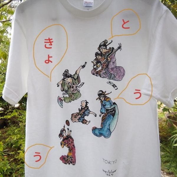世界中の多くのファンで溢れる『アニメ』の始まりは外国人にも知れ渡っている浮世絵師 葛飾北斎といわれています。その著書にも出てくる『人体文字』で浮世絵風に「とうきょう」をプリントしたTシャツです。