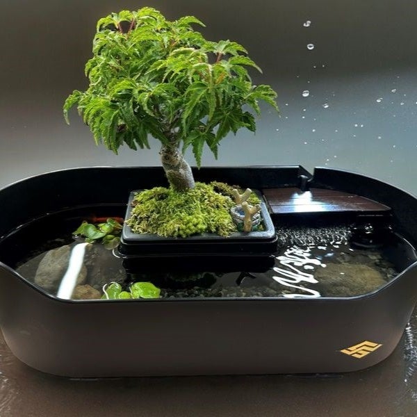 陸の景色を描く波佐見焼の盆栽鉢と観賞魚が泳ぐ器が一体となった小物。錦鯉が優雅に泳ぐ日本庭園や日本の水辺の風景をお部屋で楽しめます。