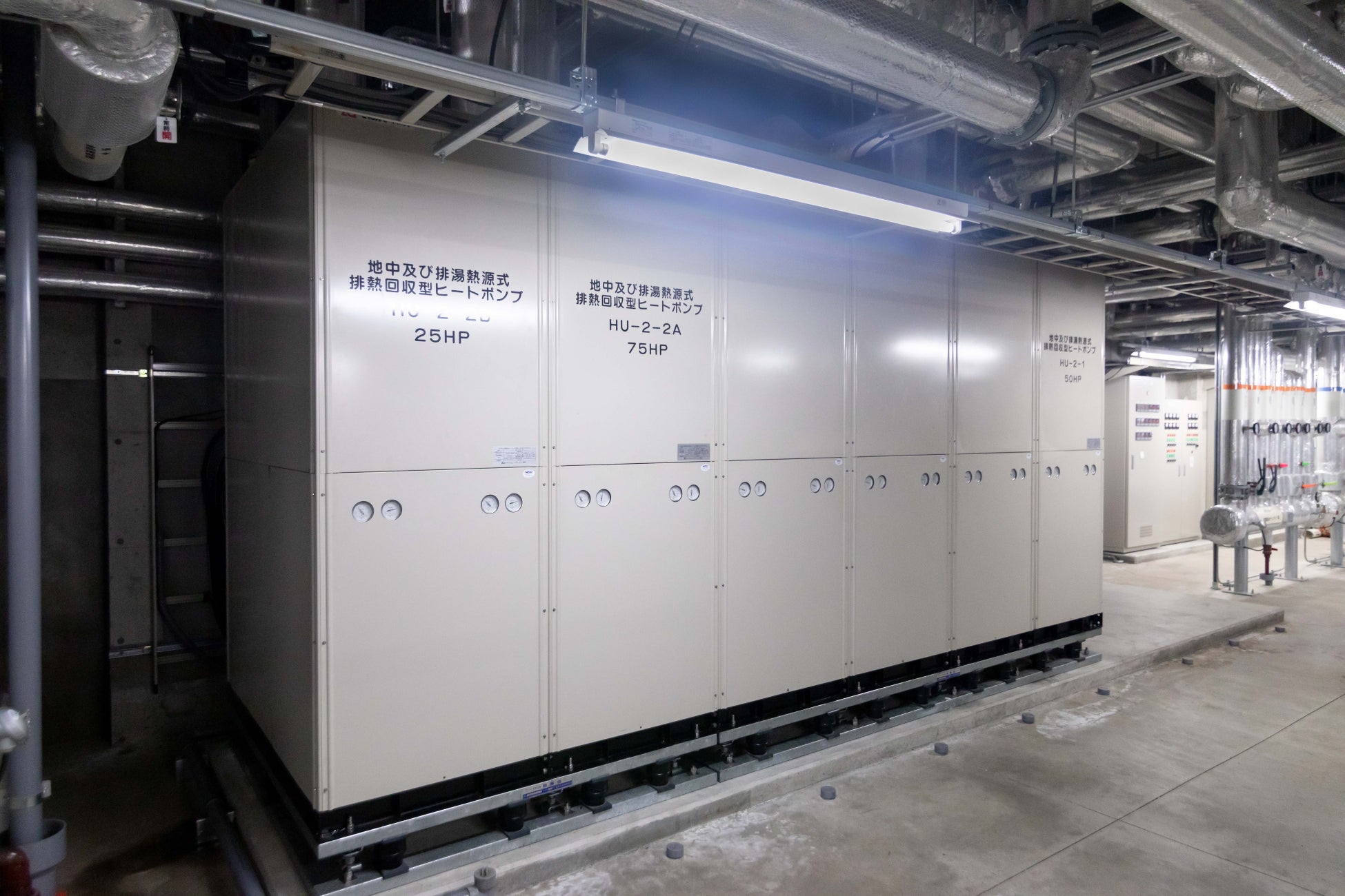 星のや軽井沢の地下には2か所の機械室があり、そこから客室や温泉、メイン棟である「集いの館」などへ、冷水・温水、そして温泉を供給しています。これらを冷やしたり温めたりするエネルギーは、温泉排湯や地中熱をヒートポンプに投入することで得られます。