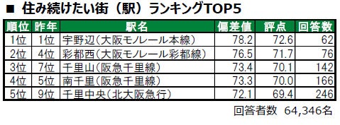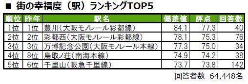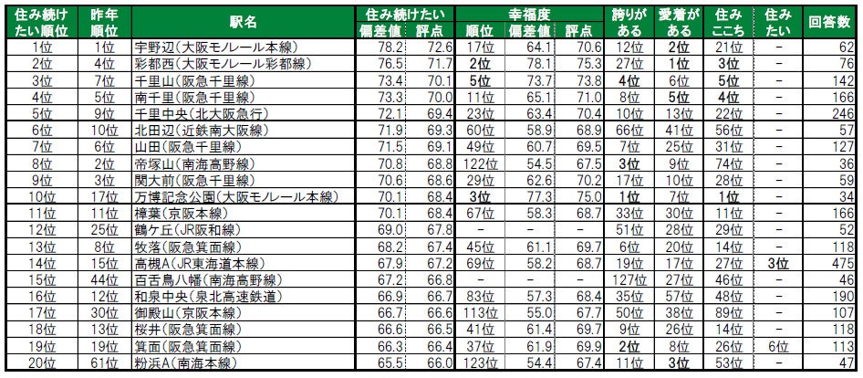 1位は3年連続で豊川で、唯一偏差値80台の極めて高い評価を得ています。2位は、2年連続で彩都西です。トップ2は、茨木市に位置する大阪モノレール彩都線沿線の駅となっています。3位は、2年連続で吹田市に位置する万博記念公園です。その他トップ10内では、8位南吹田(昨年31位)、10位藤阪(昨年56位)が、昨年から大きく順位を上げてトップ10入りしています。