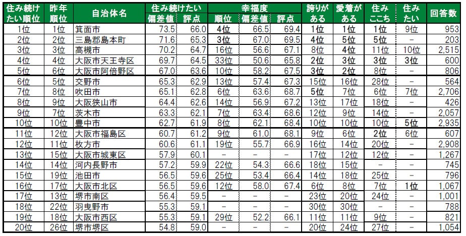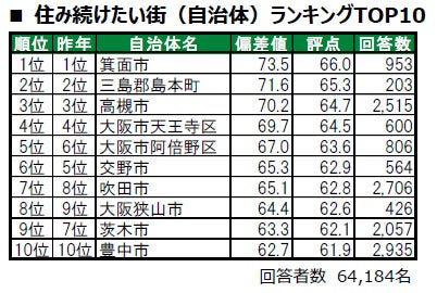 1位は2年連続で箕面市で、「住みここち(自治体)」でも1位となっている街です。2位と3位も2年連続で、2位は三島郡島本町、3位は高槻市です。トップ3は、偏差値70台の高い評価を得ています。
