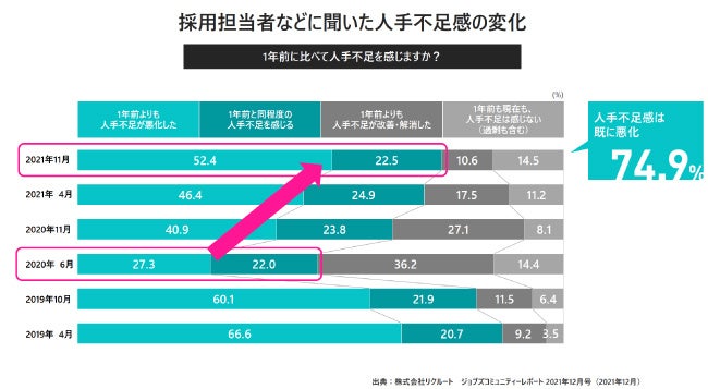 ジョブズリサーチセンターが、企業向け情報サイト「人材インフォ」のメールマガジン会員に対して、実施したアンケート調査のデータによると、人手不足を感じている企業担当者は、2020年6月と2021年11月を比較すると大きく増加しており、コロナ禍前の数値に近くなってきています。