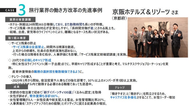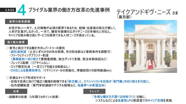 旅行領域の事例では、20代での前倒しのキャリア育成やテレワークの導入など体制を整備し女性リーダーを輩出しています。また、ブライダル領域の事例では、ママと仕事との両立可能な制度、環境の整備を行っています。2領域の事例とも、制度化により、働く人のマインドセットを変え、従業員の多様な働き方を選択可能にしています。