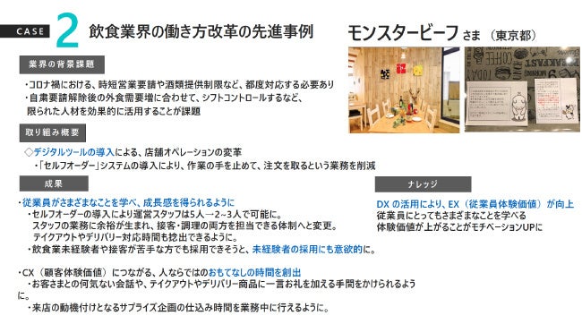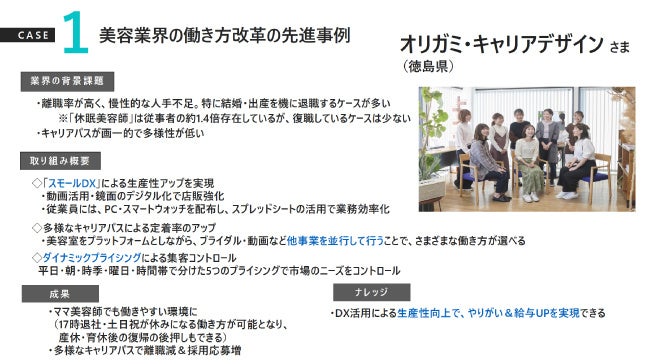 美容領域の事例では、スマートウォッチ・PC配布を行い勤怠の管理をオンラインで行うなど、デジタル活用により生産性を向上していました。飲食領域の事例では、セルフオーダーを導入。2領域とも、DXの推進により余白の時間を作り出し、本来やりたかったサービスができるようになったり、従業員に新たな仕事の機会を創出したりと新制度や体制を構築しています。