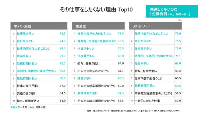 厚生労働省のデータ(出典:厚生労働省「令和2年雇用動向調査」(2021年))によると、産業別の入職率と離職率は、宿泊と飲食は離職率が入職率を上回る数字が出ています。また、ジョブズリサーチセンターの「特定業種に関する調査2019」(「業界別レポート 働く人と職場2019」)によると、「ホテル・旅館」「居酒屋」「ファストフード」の仕事をしたくないと回答した人にその理由を聞いてみたところ、共通して多いのは労働負荷となっています。